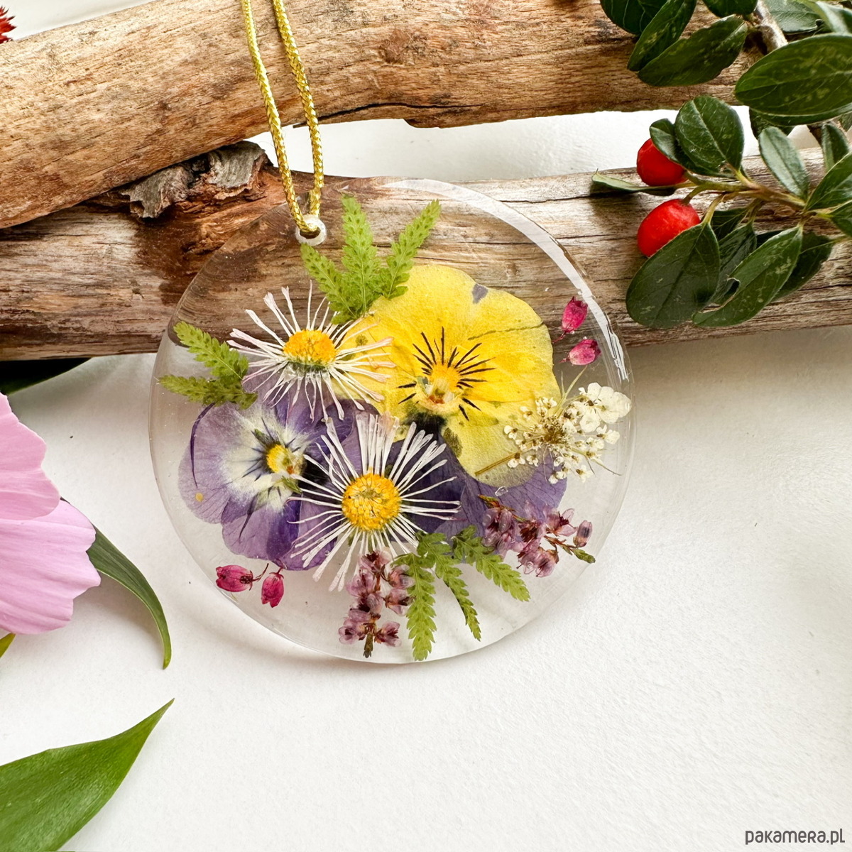 Ręcznie robiona świąteczna zawieszka z suszonymi kwiatami w kształcie okręgu to wyjątkowa dekoracja i niebanalny prezent na choinkę.
