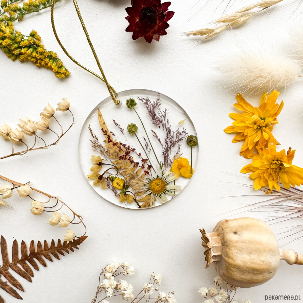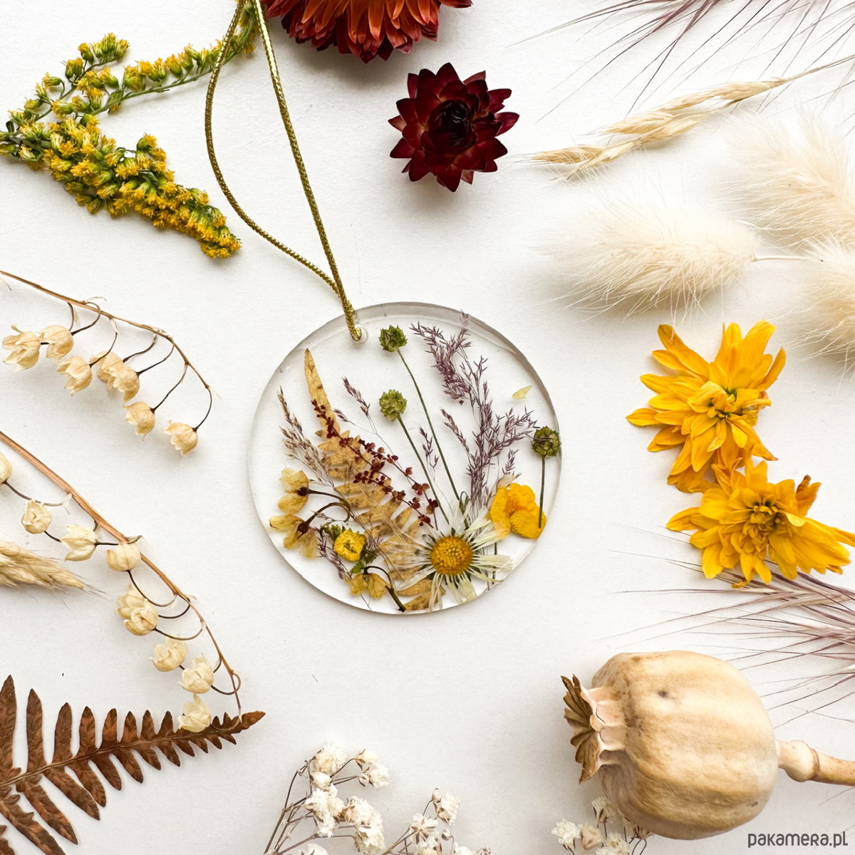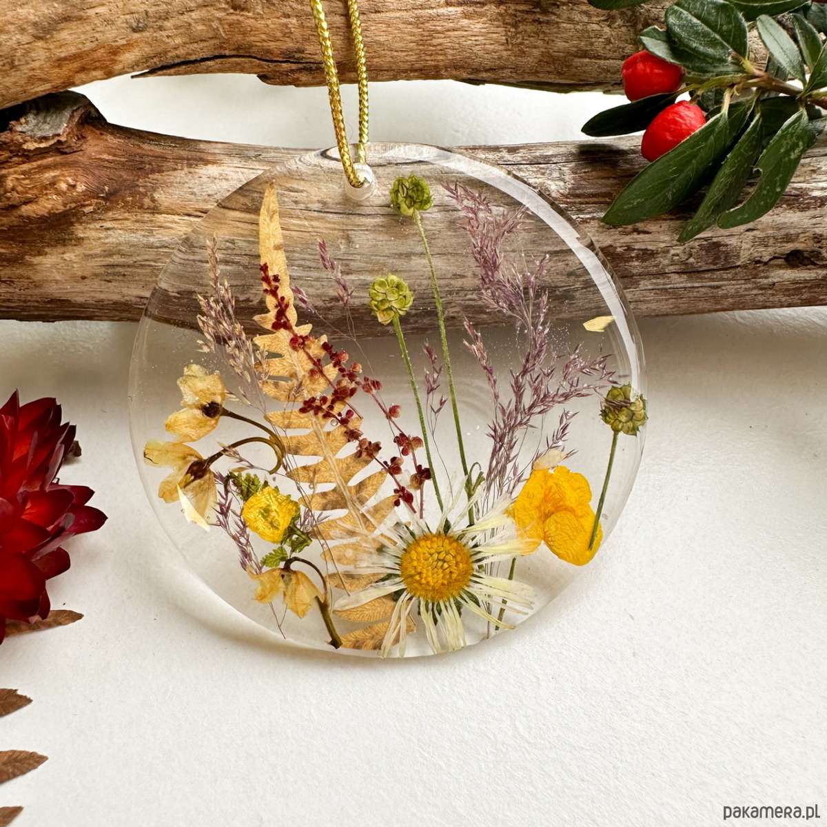 Ręcznie robiona świąteczna zawieszka z suszonymi kwiatami w kształcie okręgu to wyjątkowa dekoracja i niebanalny prezent na choinkę.
