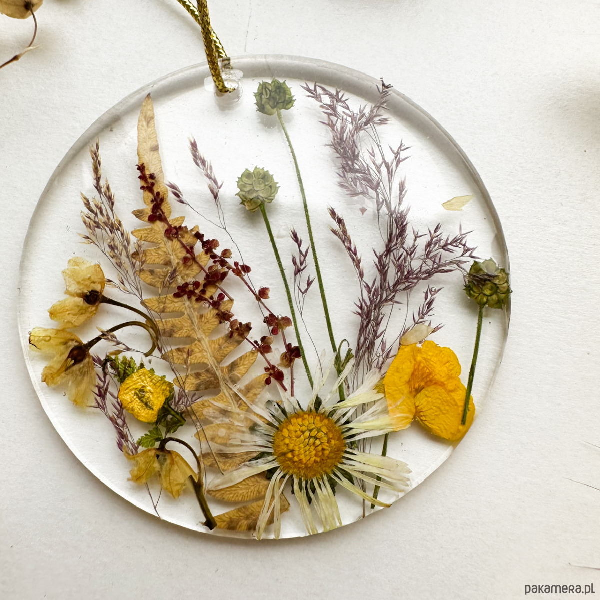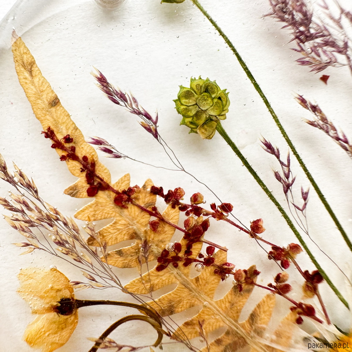 Zatopione w żywicy prawdziwe trawy, liście i rośliny łąkowe tworzą botaniczną kompozycję w stylu boho. To idealny upominek dla osób, które kochają naturę, oryginalne dodatki i unikatowy styl.