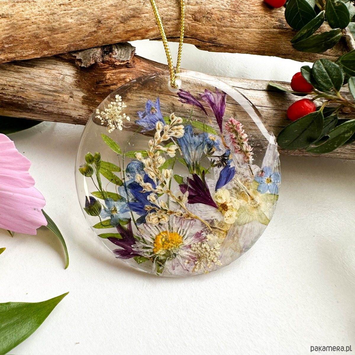 Ręcznie robiona świąteczna zawieszka z suszonymi kwiatami w kształcie okręgu to wyjątkowa dekoracja i niebanalny prezent na choinkę.
