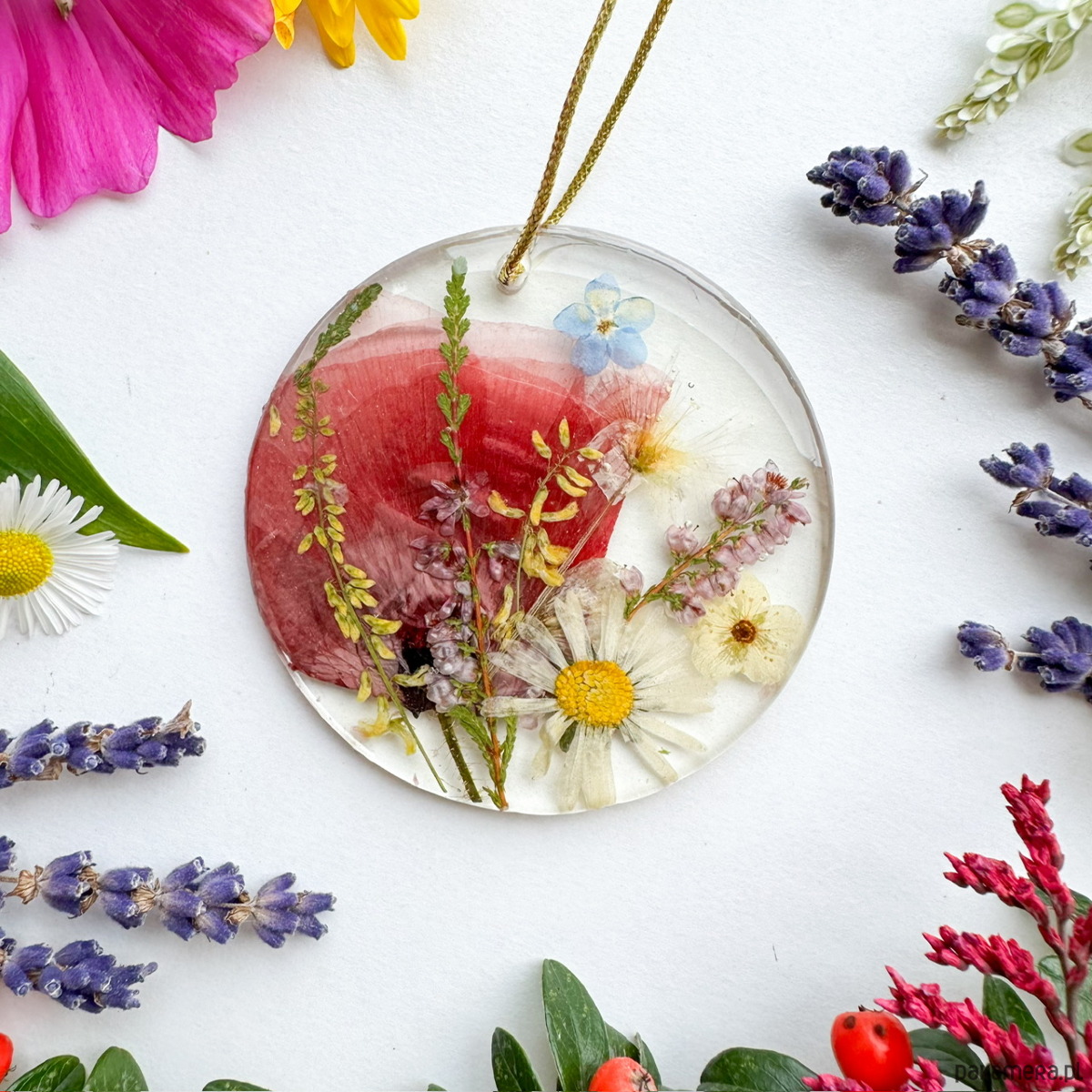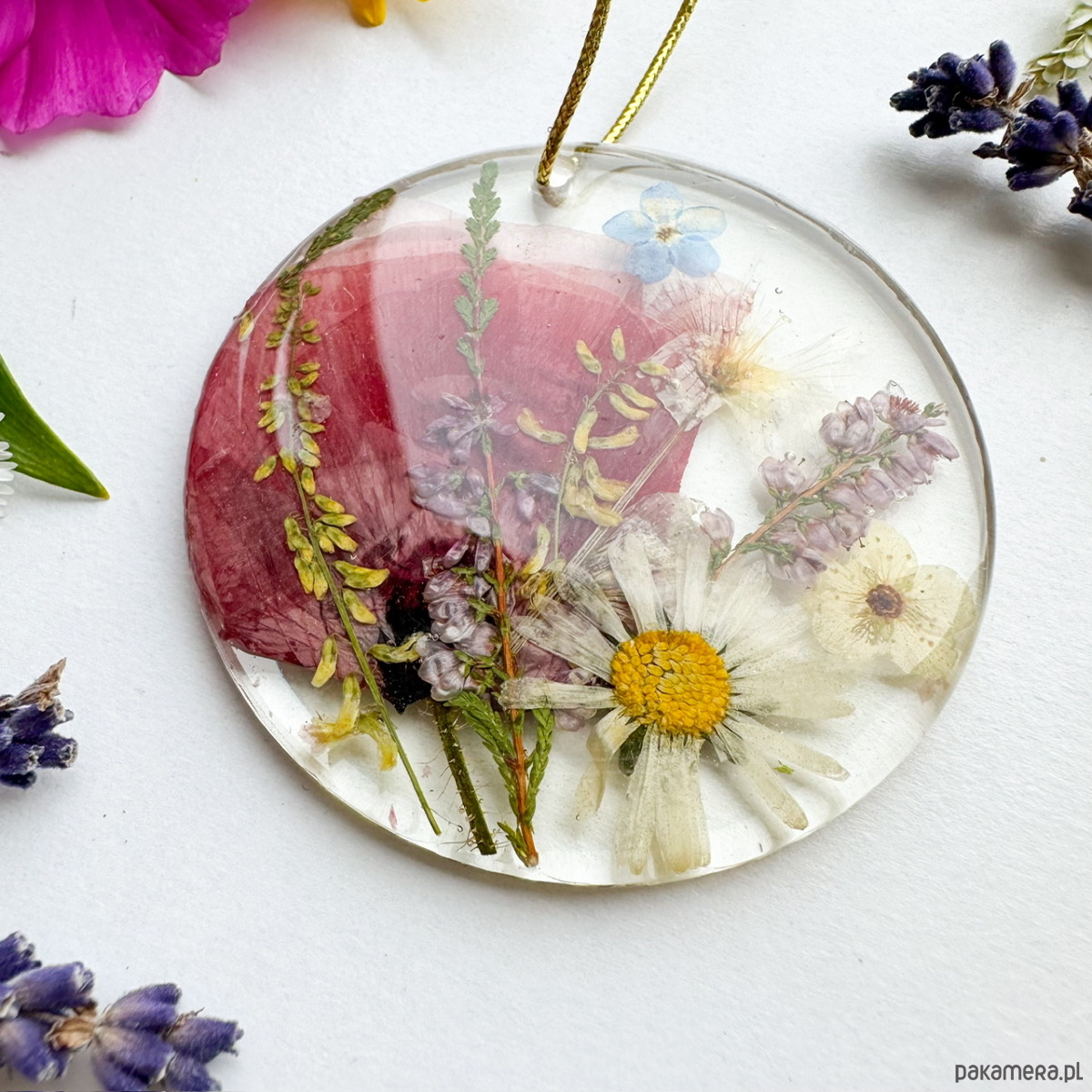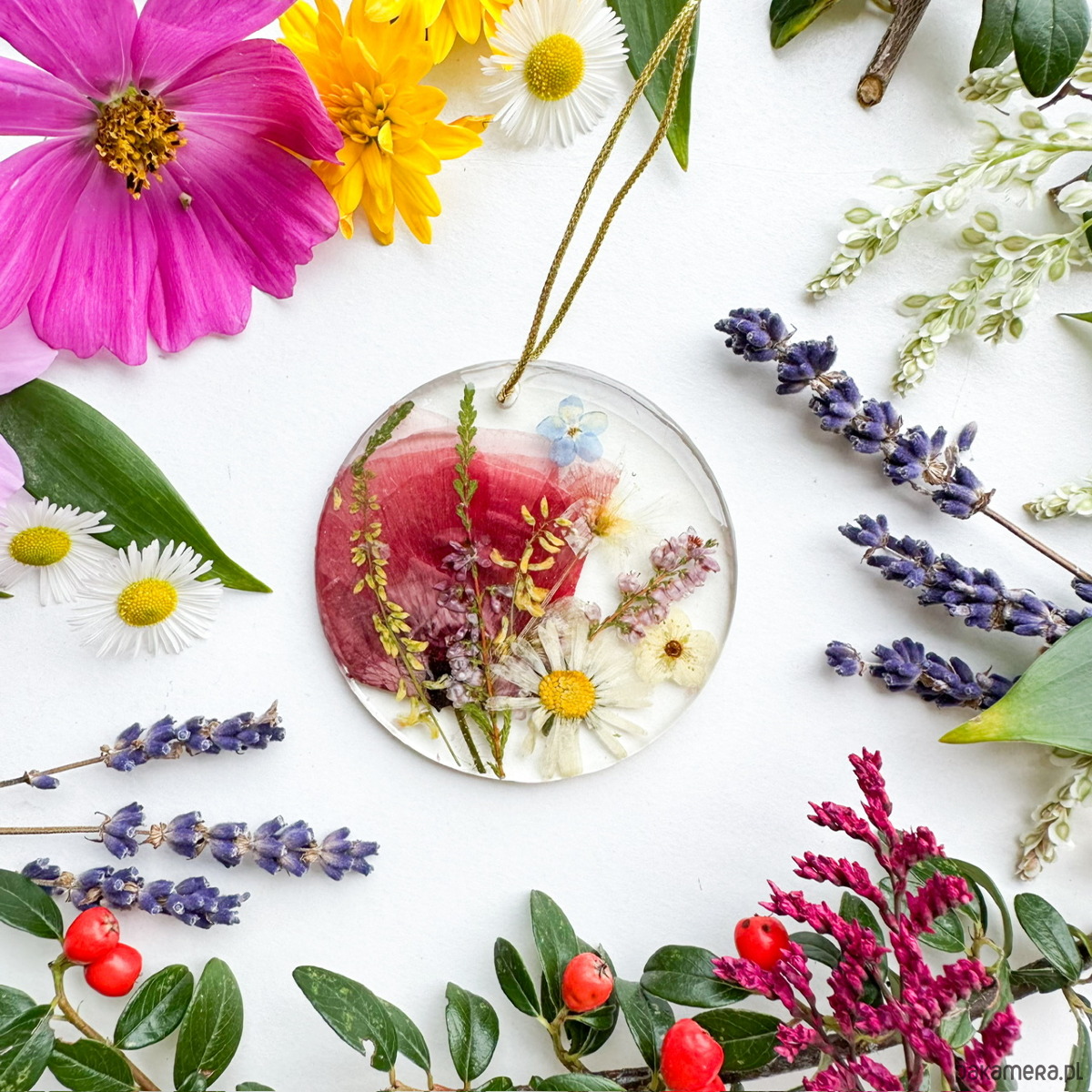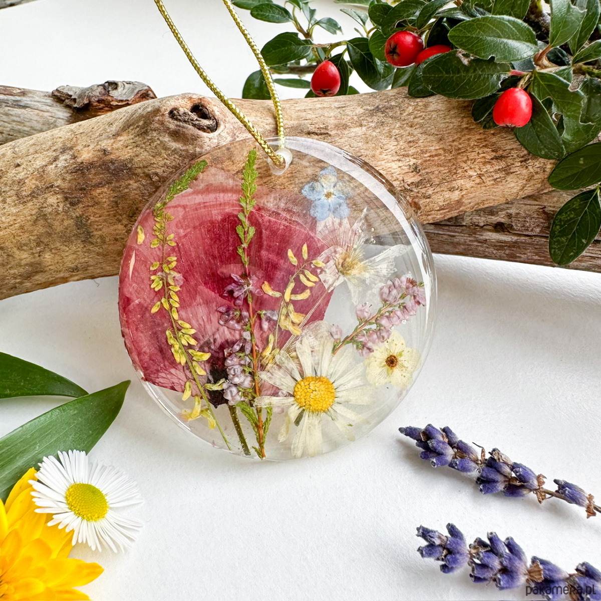 Ręcznie robiona świąteczna zawieszka z suszonymi kwiatami w kształcie okręgu to wyjątkowa dekoracja i niebanalny prezent na choinkę.