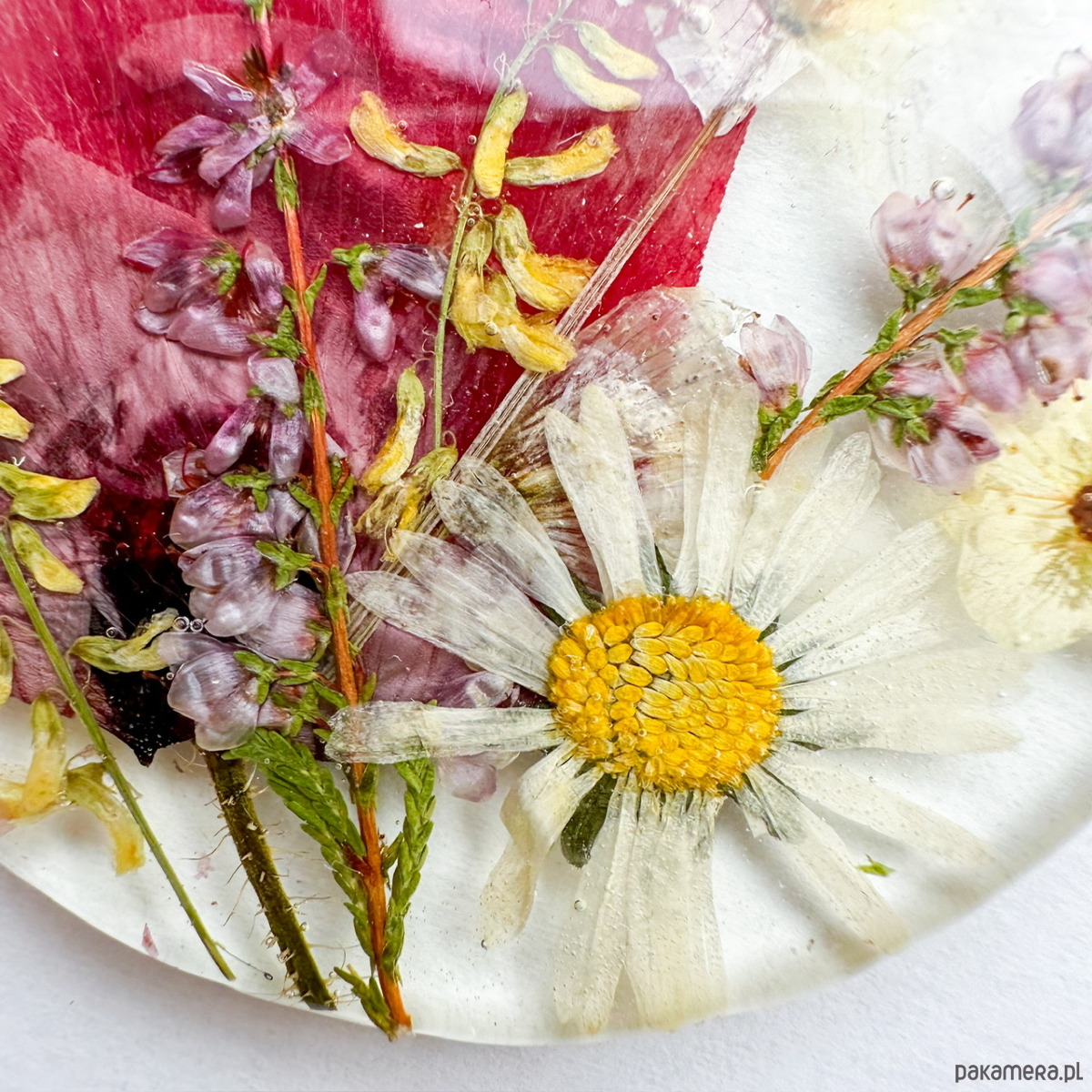 Zatopione w żywicy prawdziwe trawy, liście i rośliny łąkowe tworzą botaniczną kompozycję w stylu boho. To idealny upominek dla osób, które kochają naturę, oryginalne dodatki i unikatowy styl.