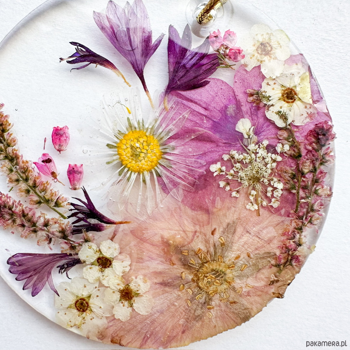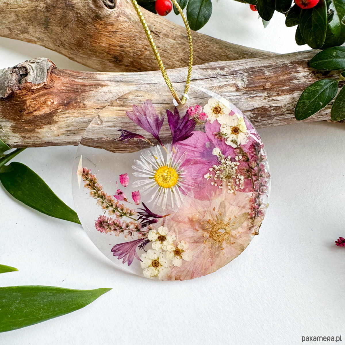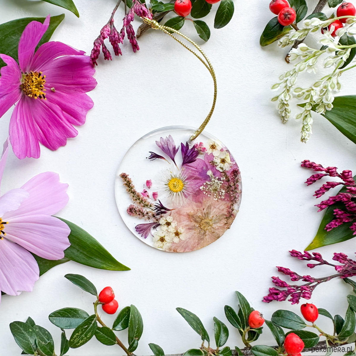 Ręcznie robiona świąteczna zawieszka z suszonymi kwiatami w kształcie okręgu to wyjątkowa dekoracja i niebanalny prezent na choinkę.