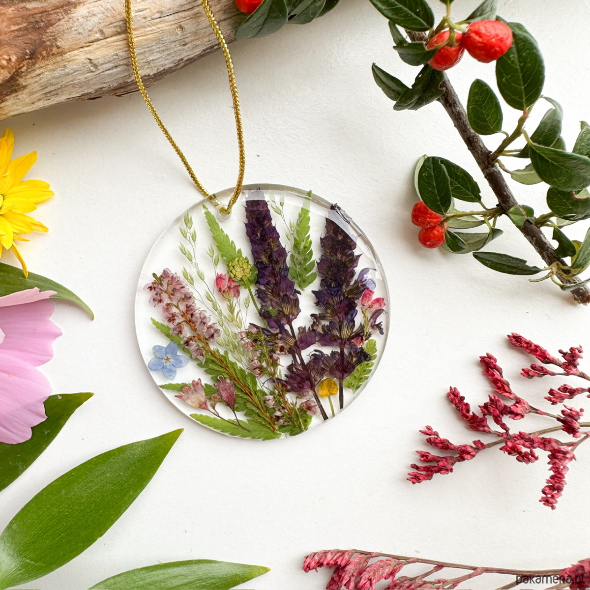 Ręcznie robiona świąteczna zawieszka z suszonymi kwiatami w kształcie okręgu to wyjątkowa dekoracja i niebanalny prezent na choinkę.