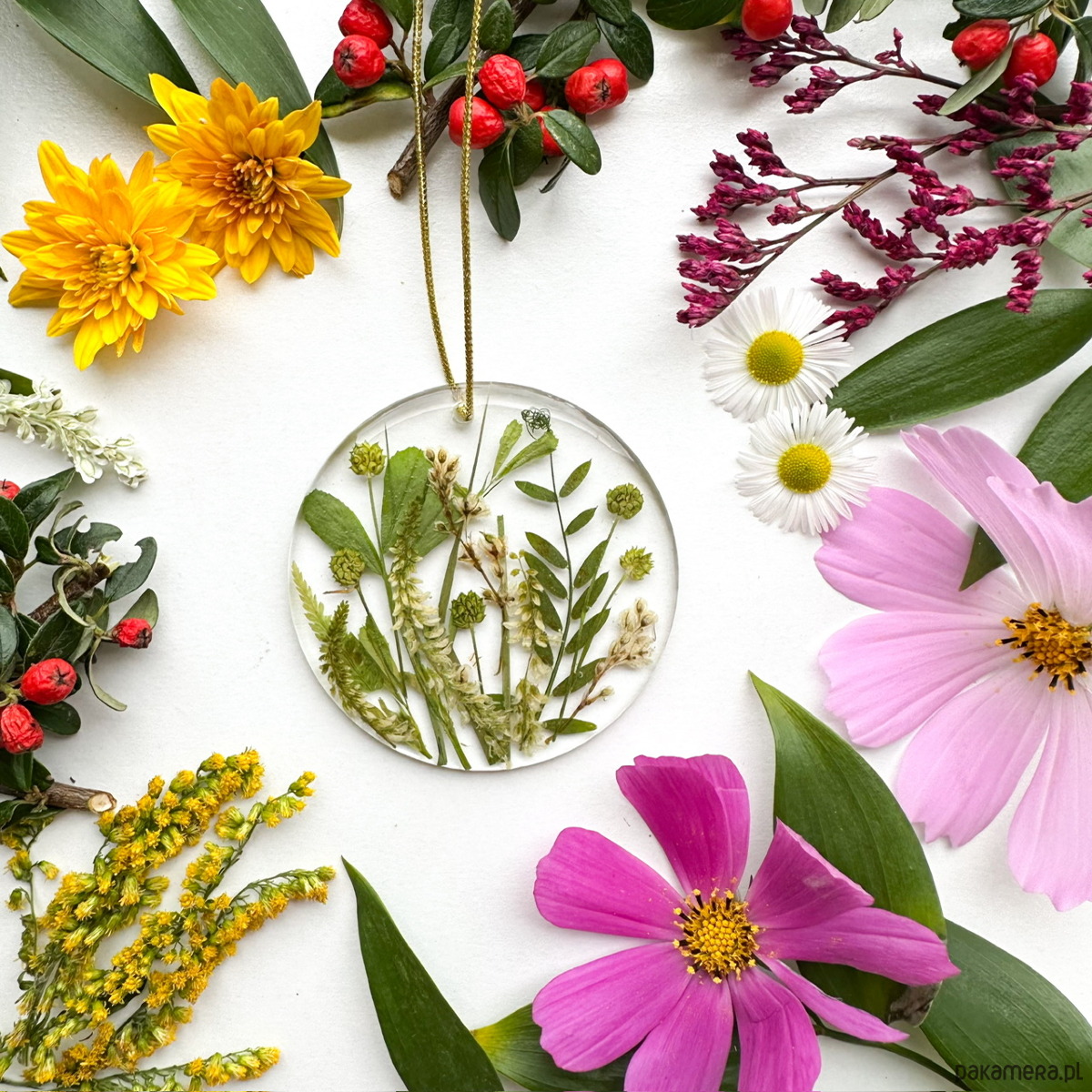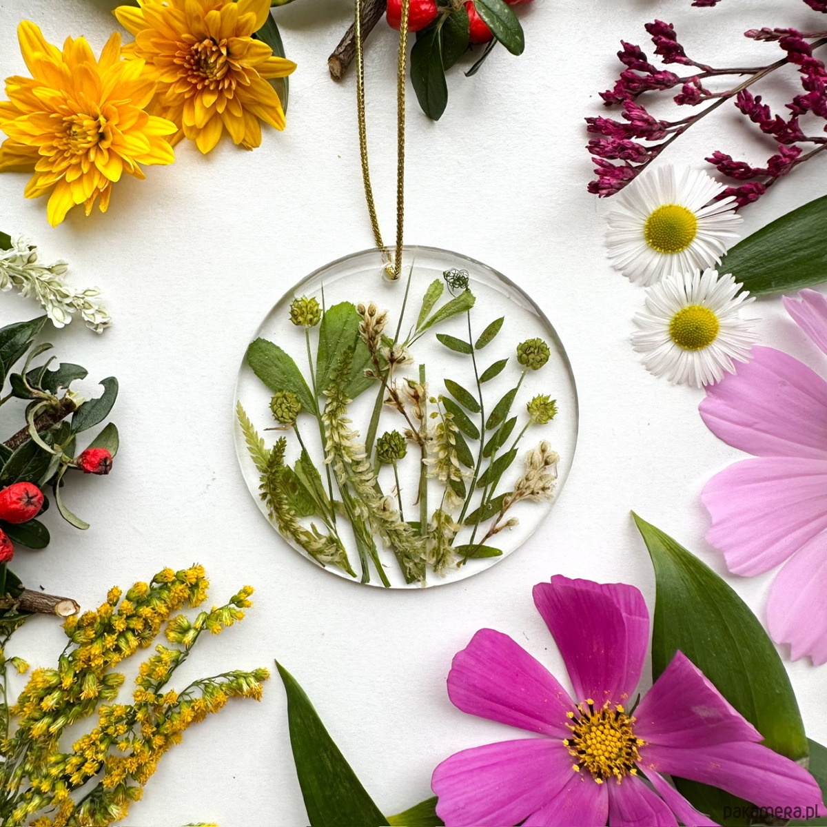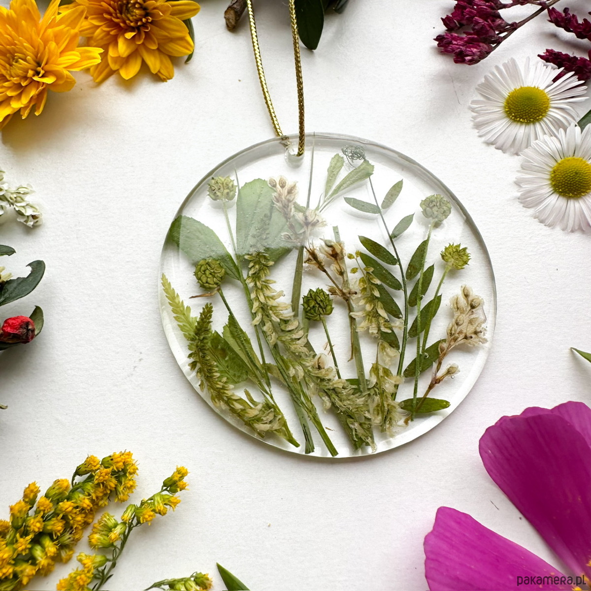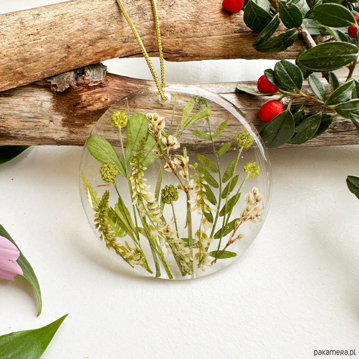 Zatopione w żywicy prawdziwe trawy, liście i rośliny łąkowe tworzą botaniczną kompozycję w stylu boho. To idealny upominek dla osób, które kochają naturę, oryginalne dodatki i unikatowy styl.