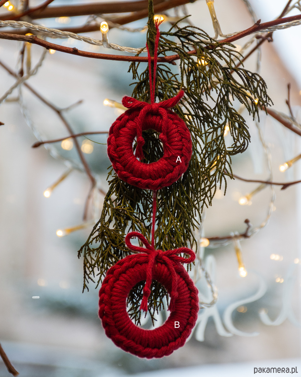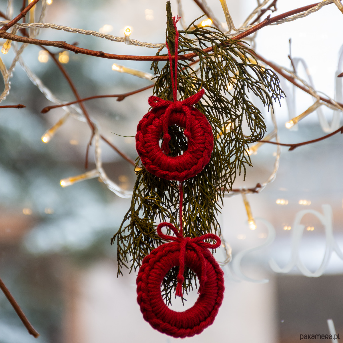 Ozdoba choinkowa na drewnianym kółeczku z czerwonego sznurka, pięknie ozdobi twoje świąteczne dekoracje.