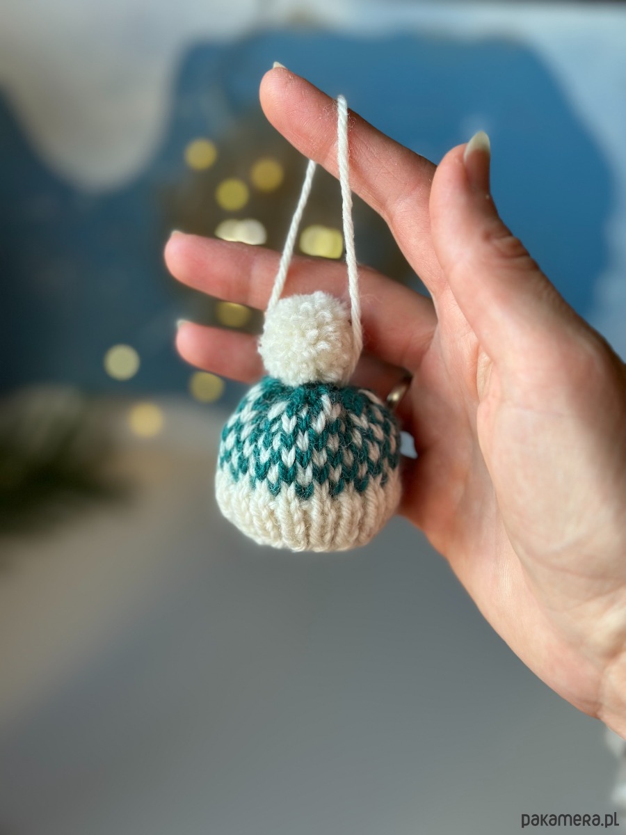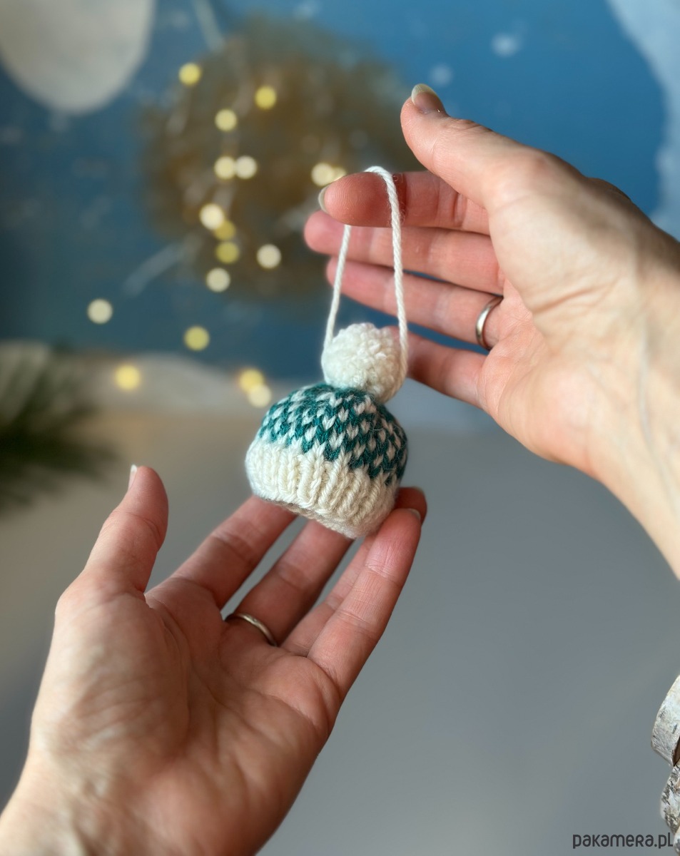 Ozdoba choinkowa mini-czapeczka, wykonana ręcznie na drutach z naturalnych włóczek składających się z wełny owczej.