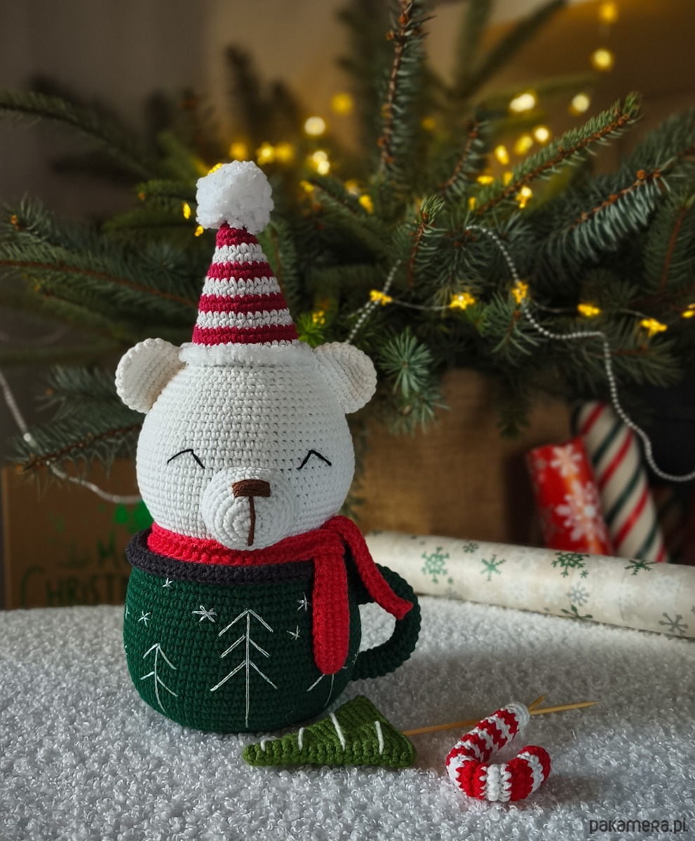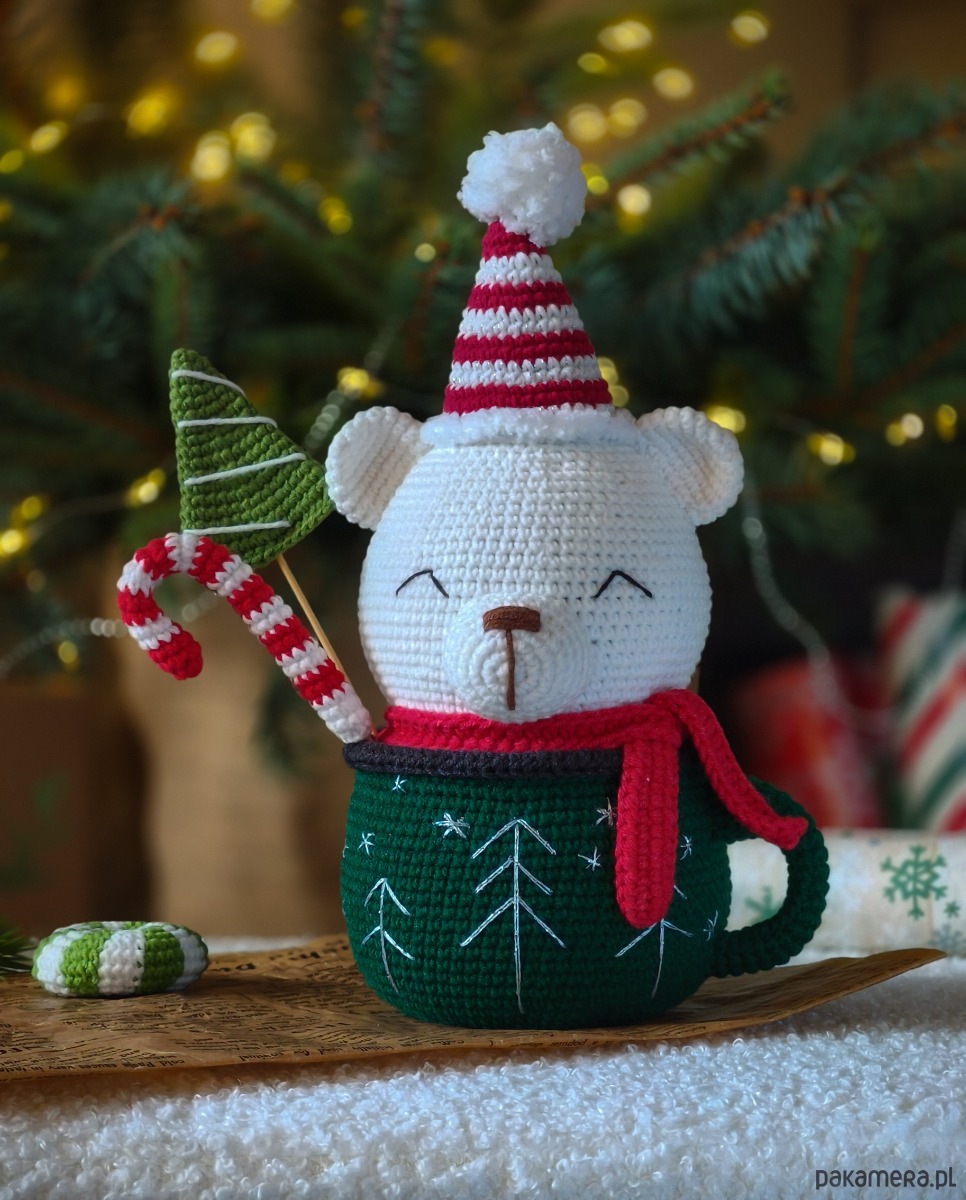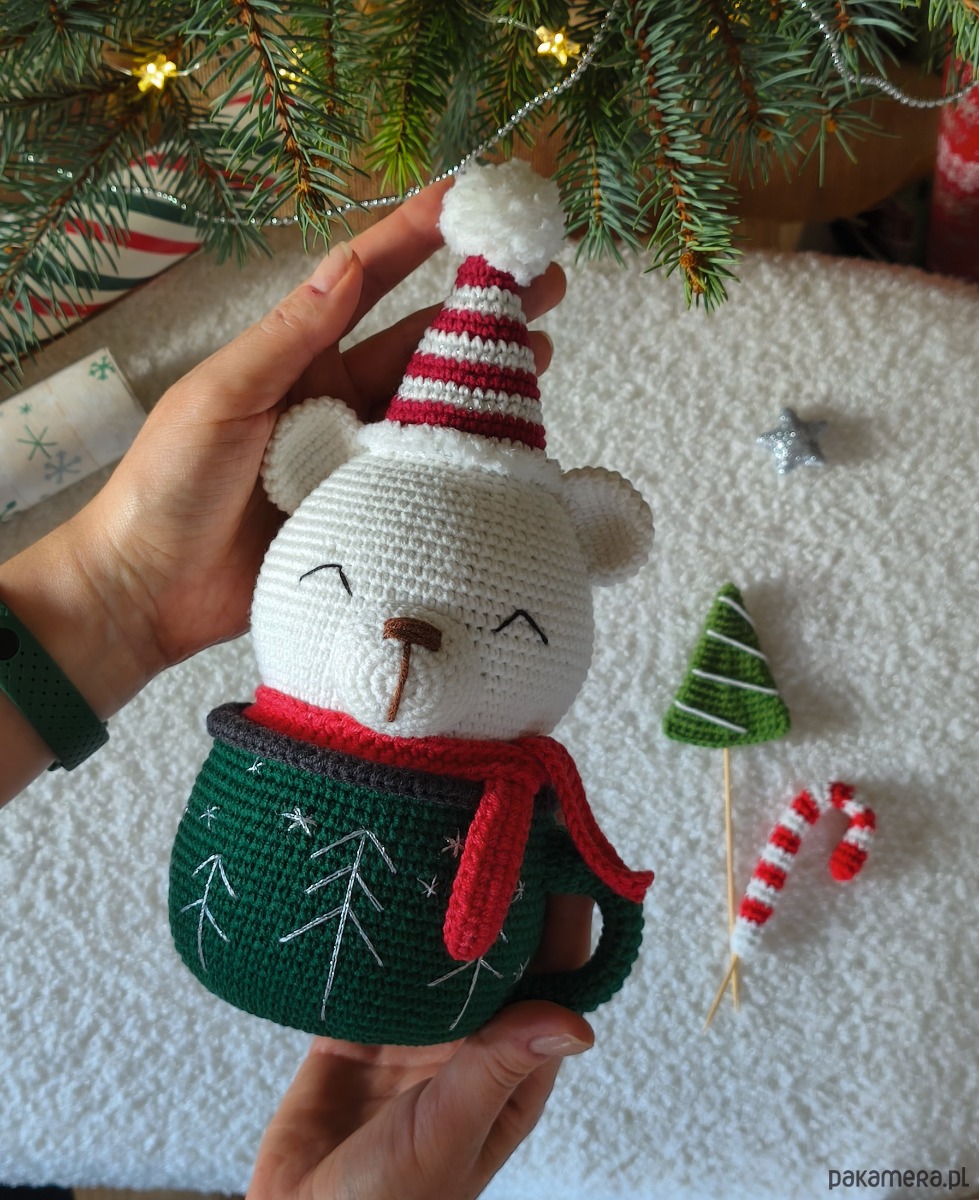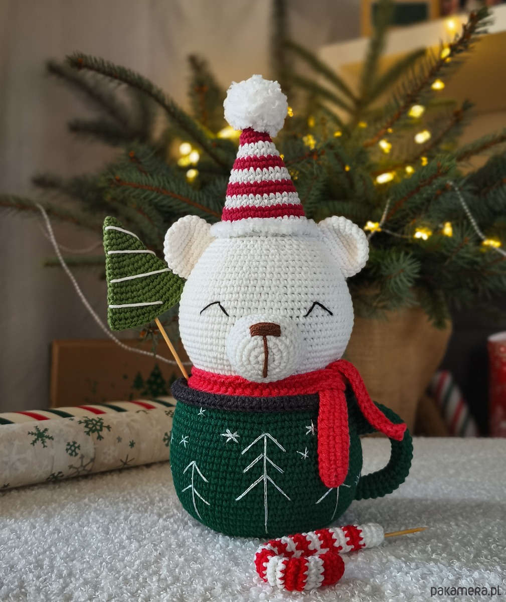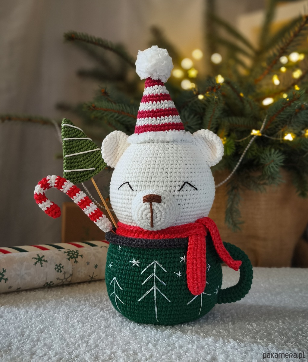Świąteczny miś w kubku wykonany na szydełku to doskonały i unikalny prezent na Święta Bożego Narodzenia dla całej rodziny czy przyjaciół. To świetny prezent do dekoracji wnętrz lub unikalną dekoracją do biura czy na półkę z książkami.