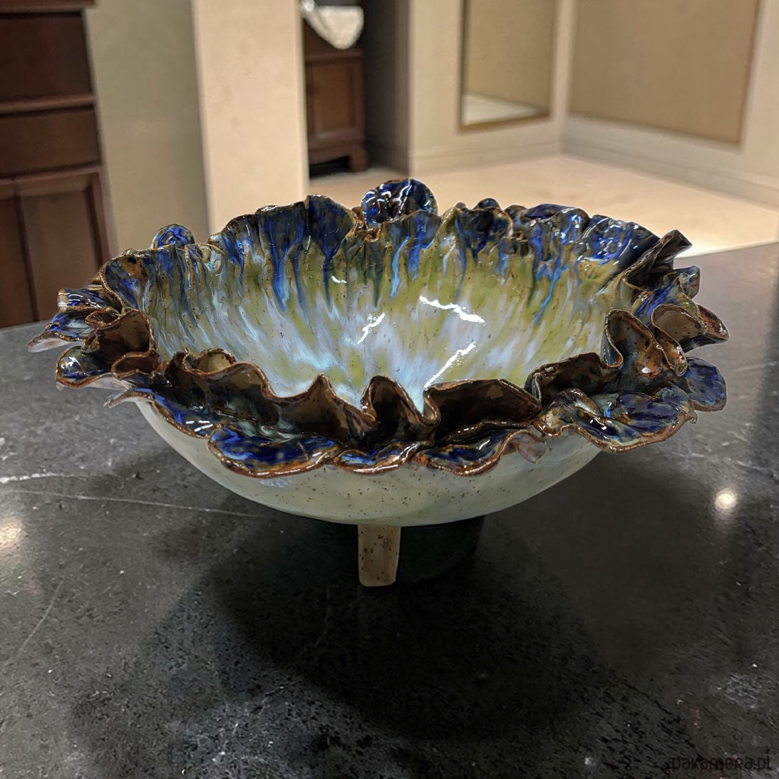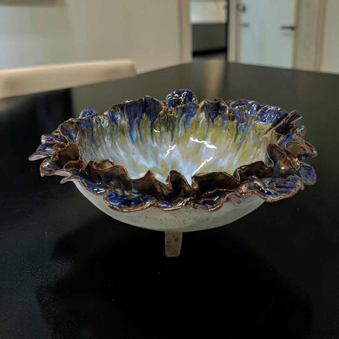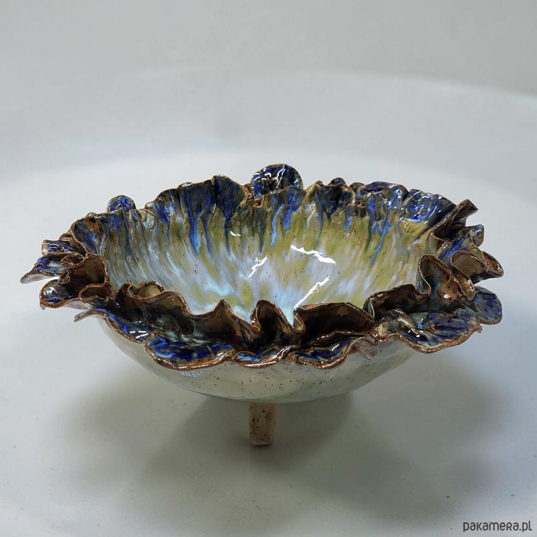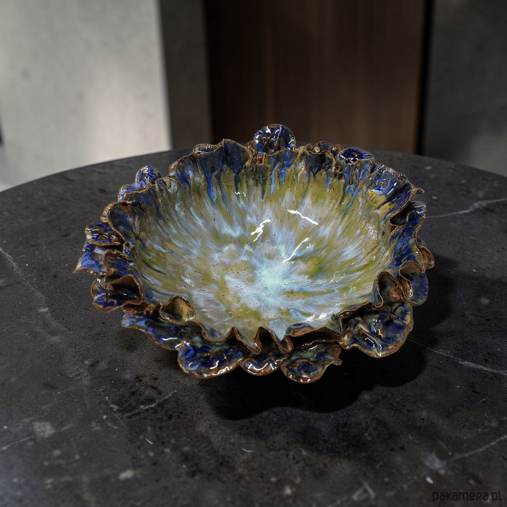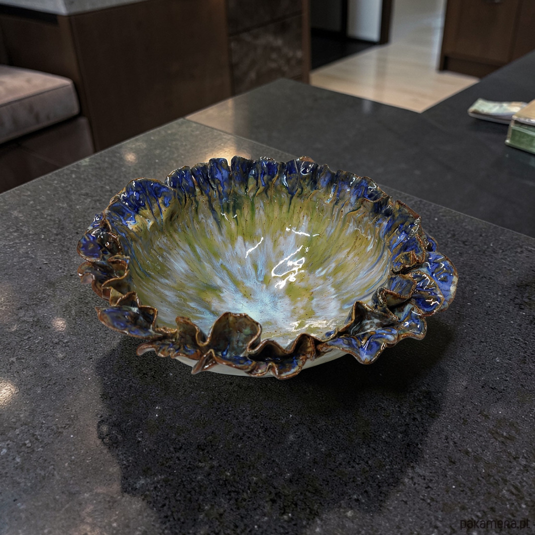 Ręcznie formowana misa o organicznej, falującej krawędzi.