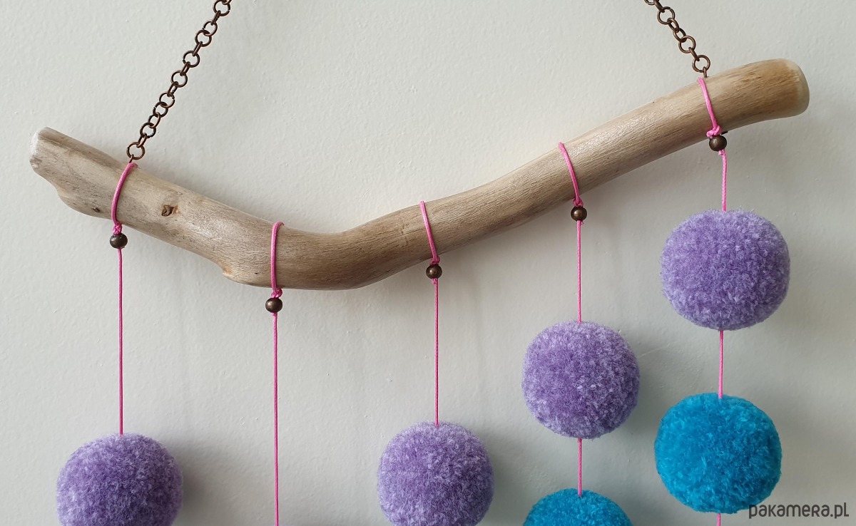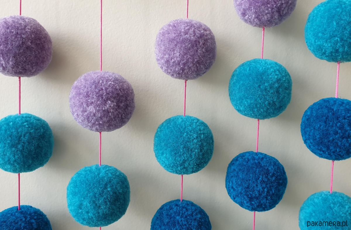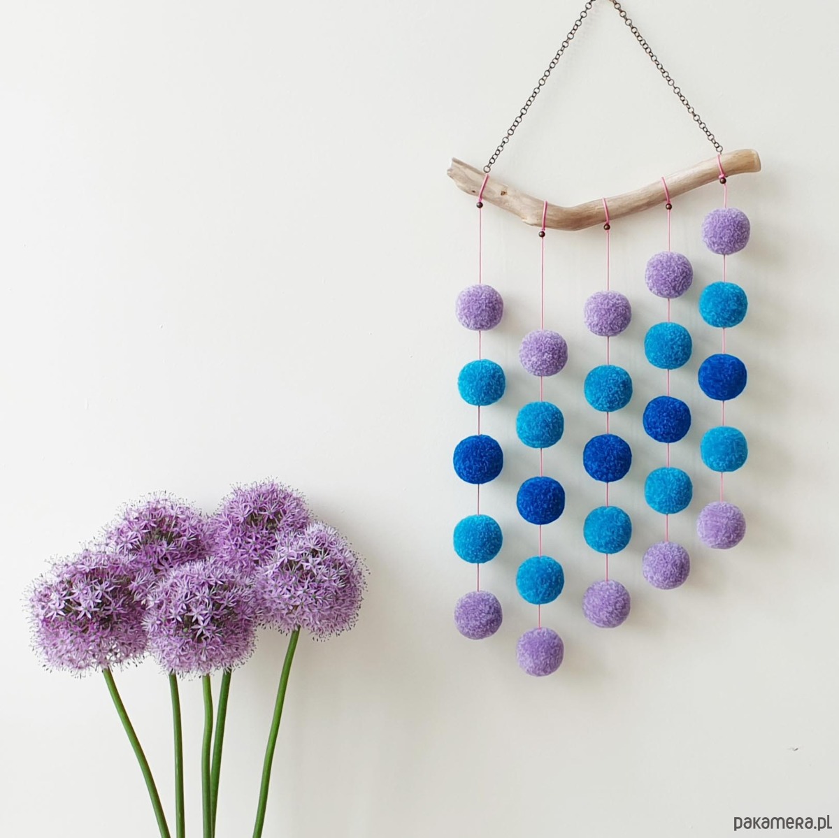 Ta ozdoba ścienna w odcieniach niebieskiego i fioletowego z pomponów to ręcznie wykonana dekoracja, która doskonale ożywi każde wnętrze.