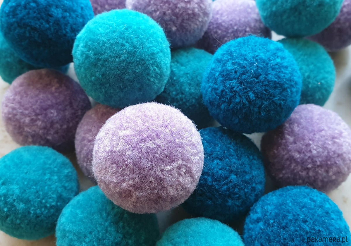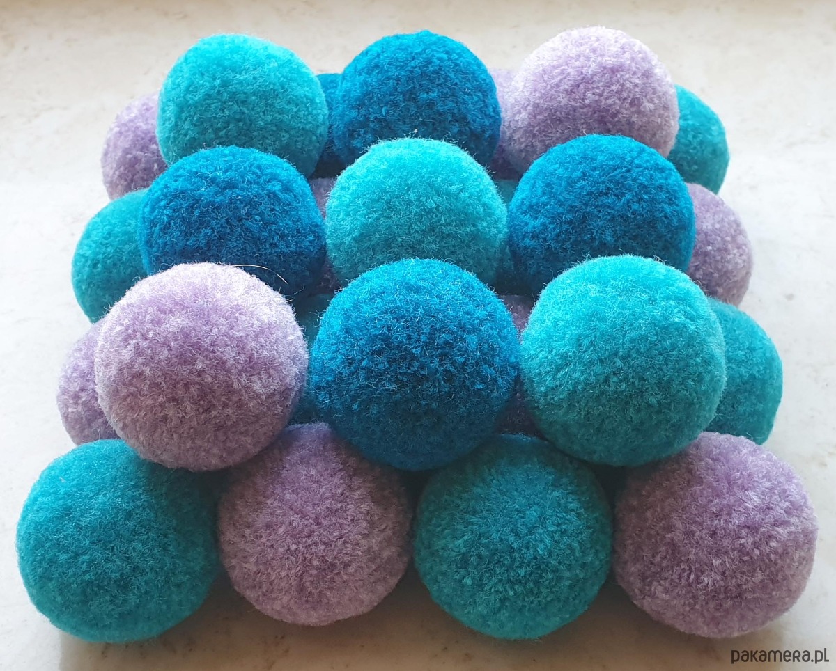 Pompony wykonane z miękkiej, puszystej włóczki zostały starannie rozmieszczone, tworząc niepowtarzalny, przyciągający wzrok wzór.