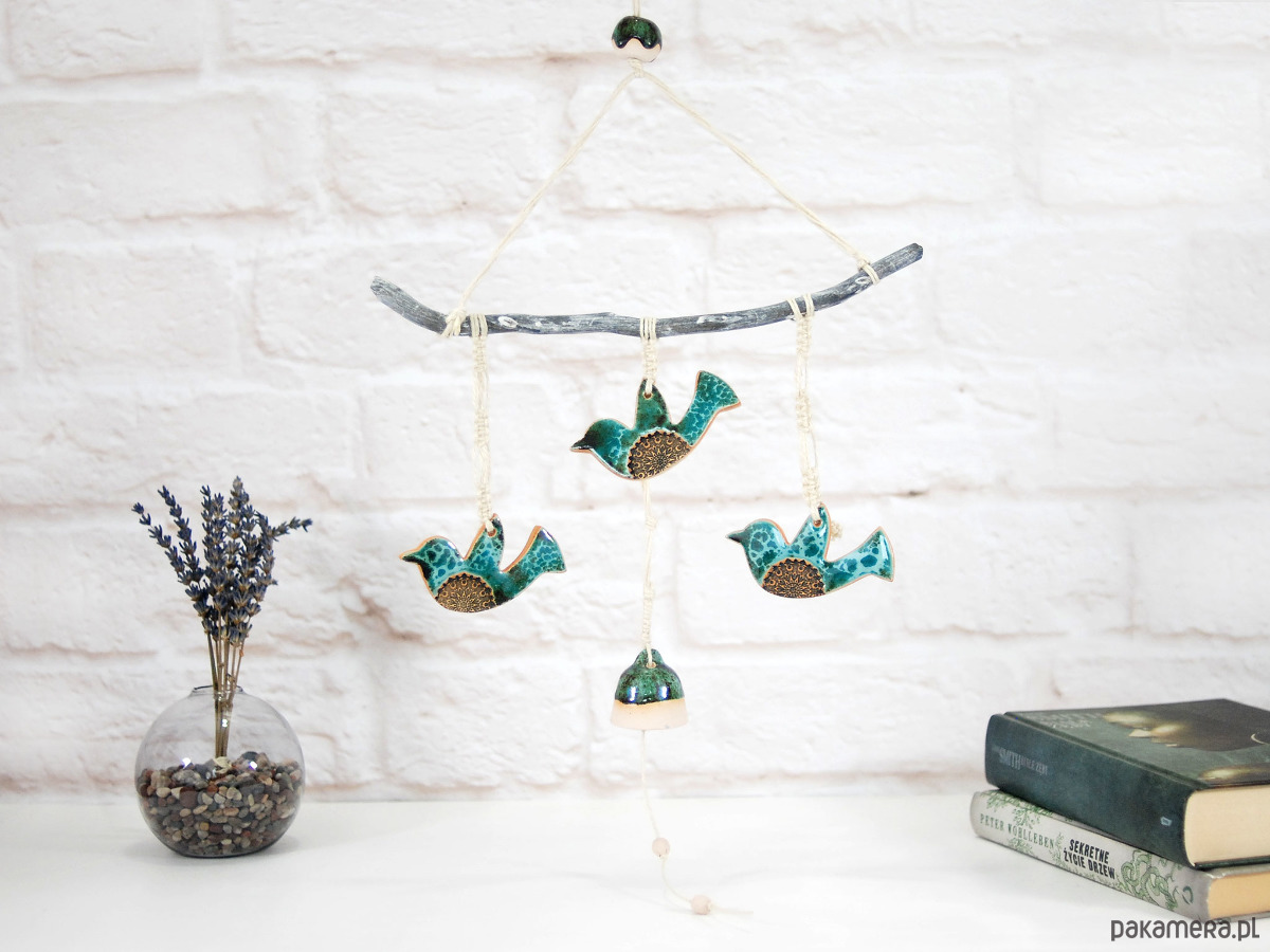 Dekoracja wiszącą w stylu boho. Dzięki przestrzennej konstrukcji dekoracja nie jest statyczna – ptaki delikatnie wirują, wprowadzając do pomieszczenia harmonię i spokój. Idealna do powieszenia na ścianie w sypialni, w oknie salonu lub jako mobilna ozdoba w strefie relaksu. Dekoracja będzie doskonałym prezentem na Dzień Babci, Walentynki lub Dzień Mamy.
