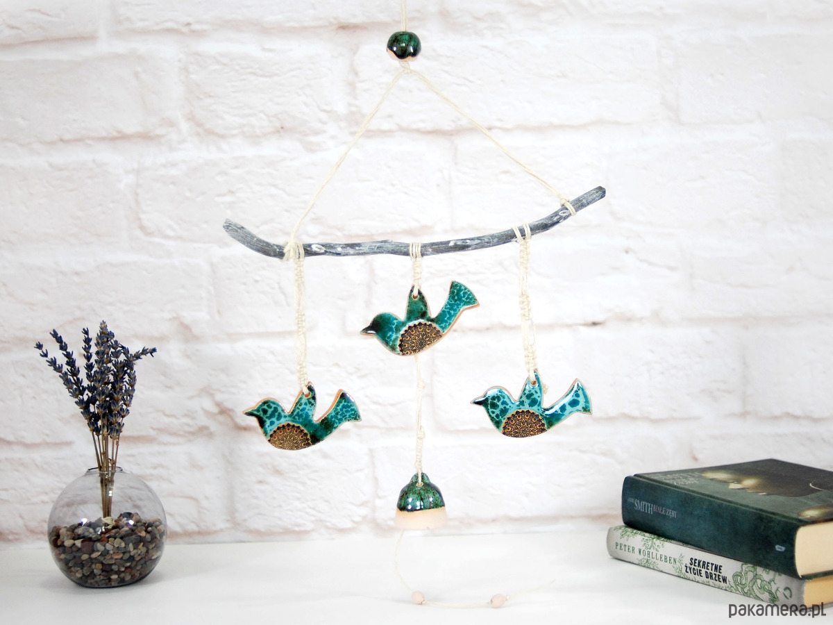 Dekoracja wiszącą w stylu boho. Dzięki przestrzennej konstrukcji dekoracja nie jest statyczna – ptaki delikatnie wirują, wprowadzając do pomieszczenia harmonię i spokój. Idealna do powieszenia na ścianie w sypialni, w oknie salonu lub jako mobilna ozdoba w strefie relaksu. Dekoracja będzie doskonałym prezentem na Dzień Babci, Walentynki lub Dzień Mamy.