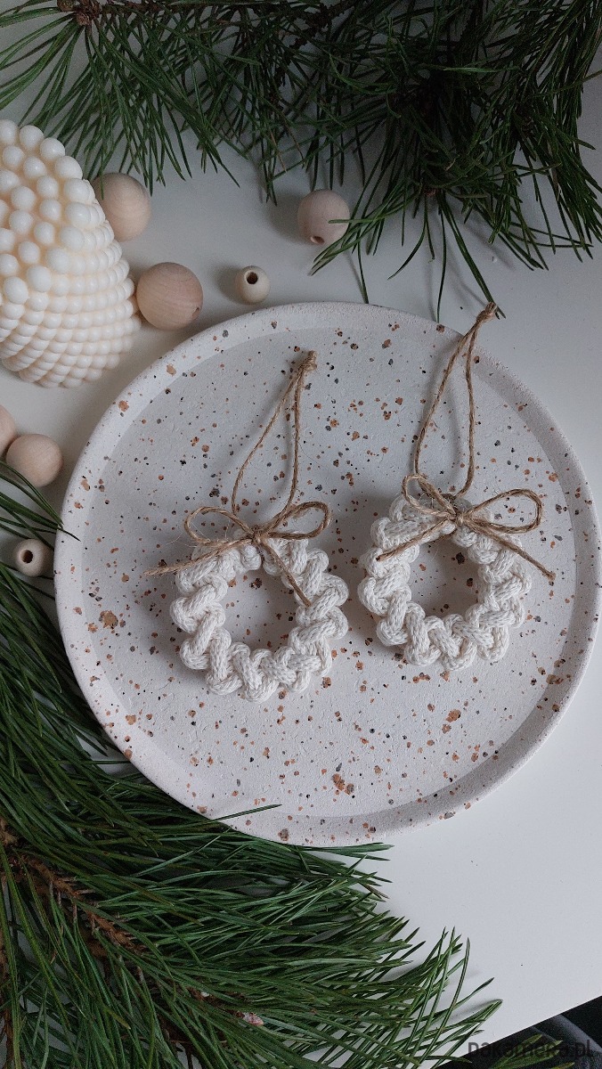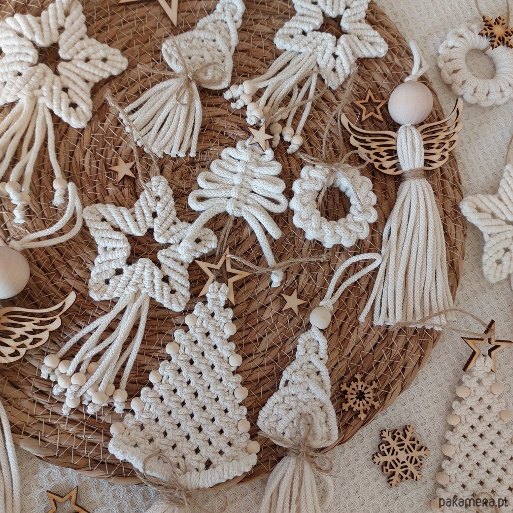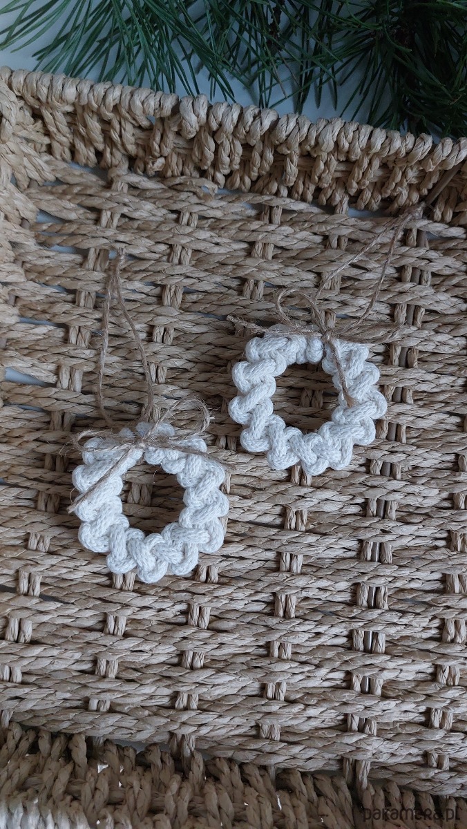 Ozdoba choinkowa wykonana własnoręcznie ze sznurka bawełnianego 5mm w kolorze naturalnym z jutowymi dodatkami