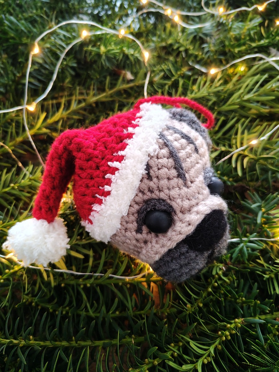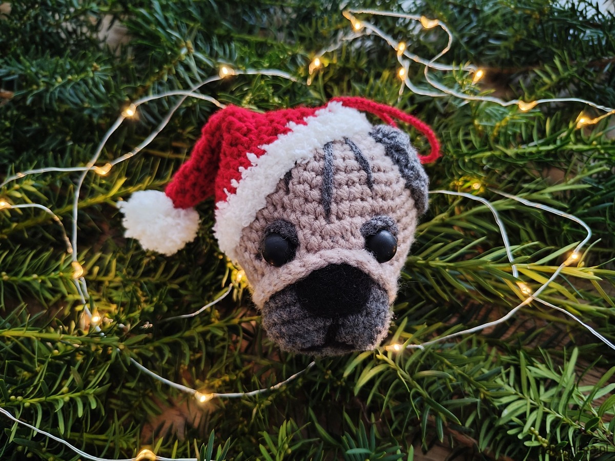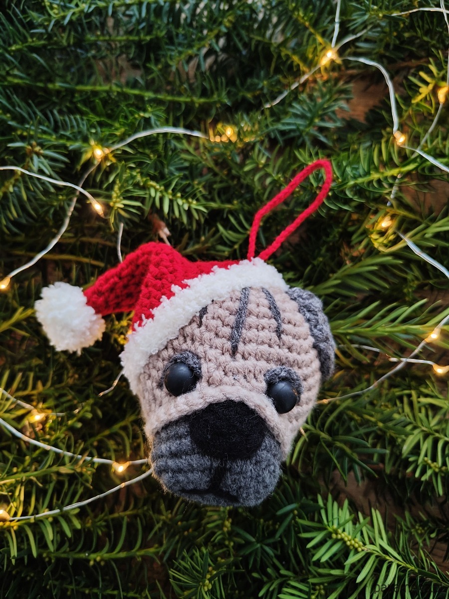 Szydełkowa ozdoba świąteczna w kształcie mopsa to niepowtarzalny świąteczny drobiazg dla miłośników psów!