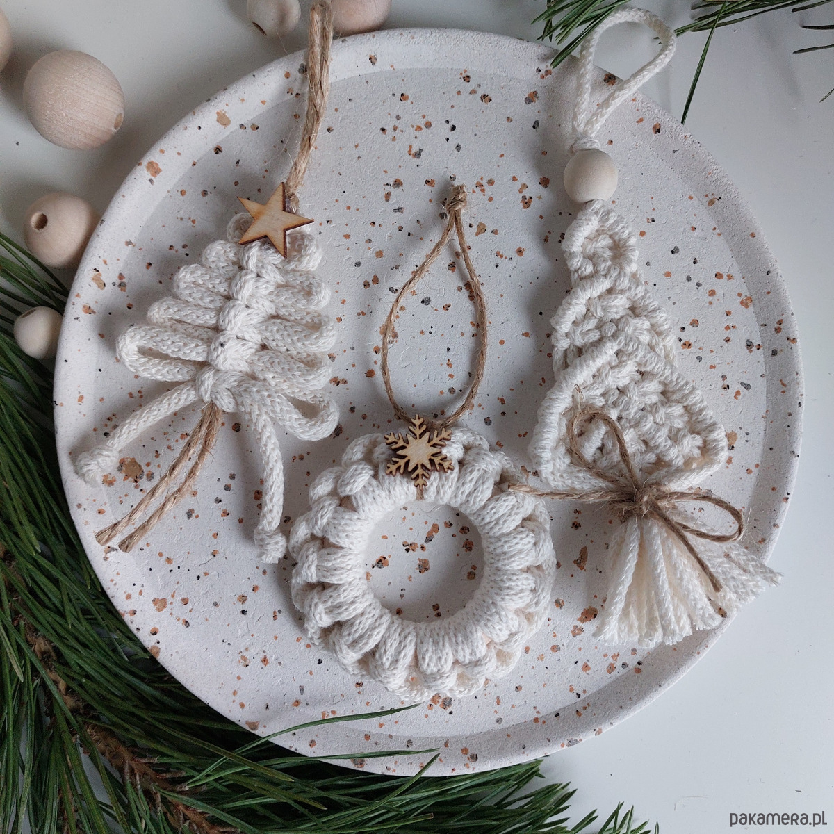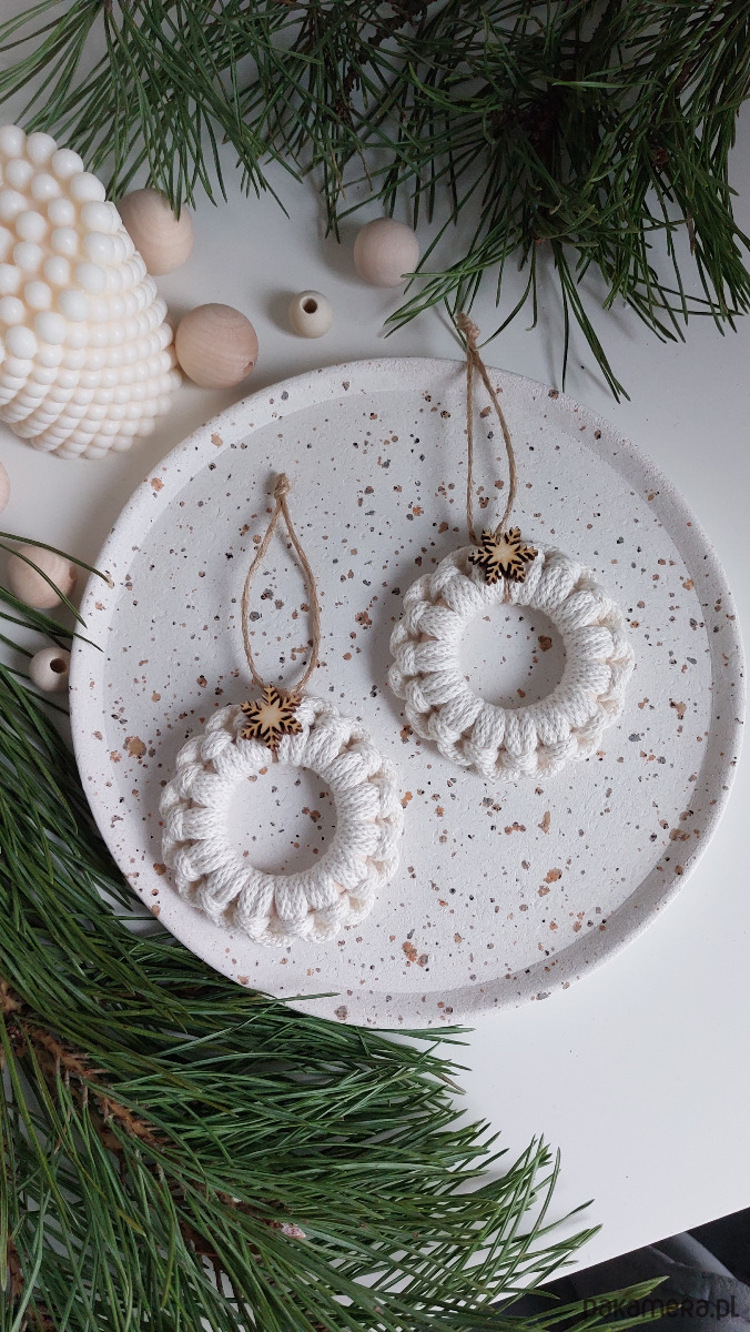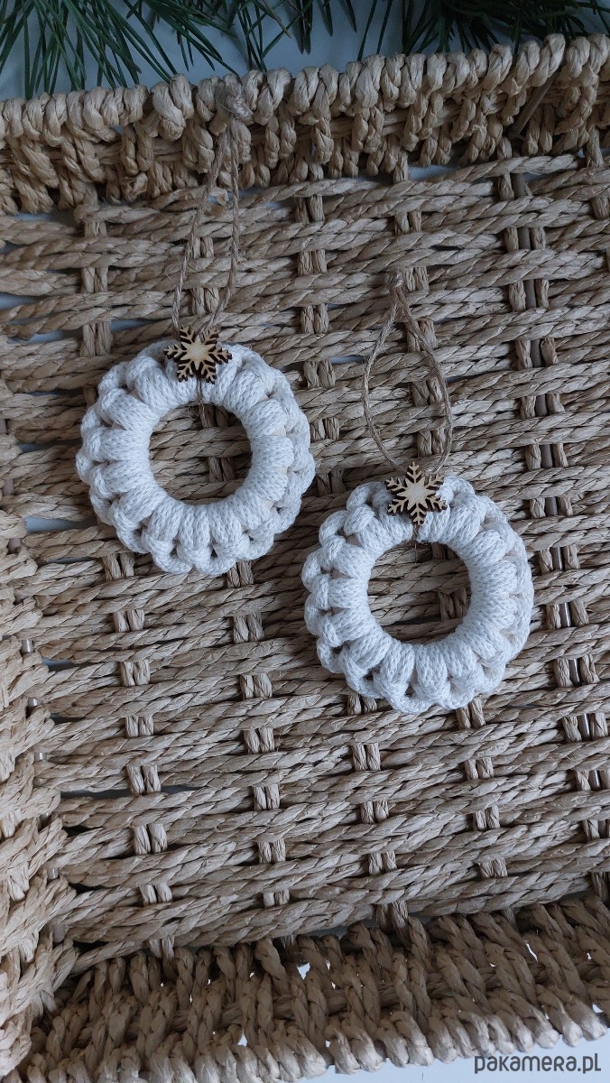 Ozdoba choinkowa wykonana własnoręcznie ze sznurka bawełnianego 5mm w kolorze naturalnym z drewnianymi elementami.