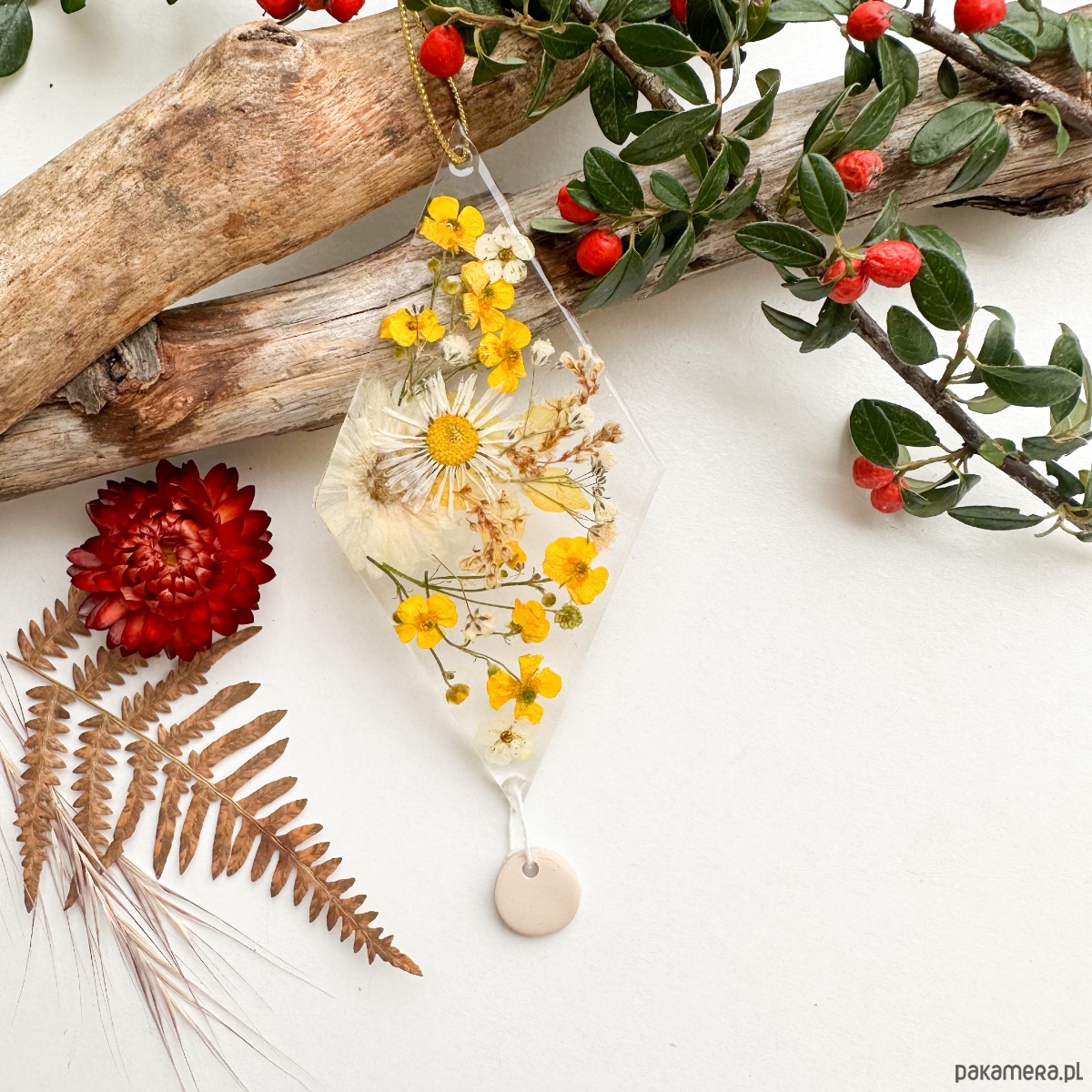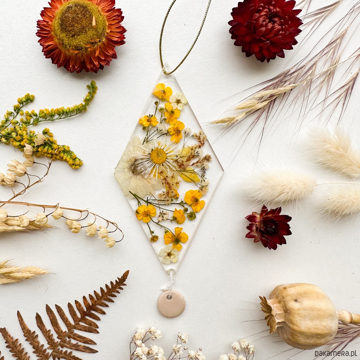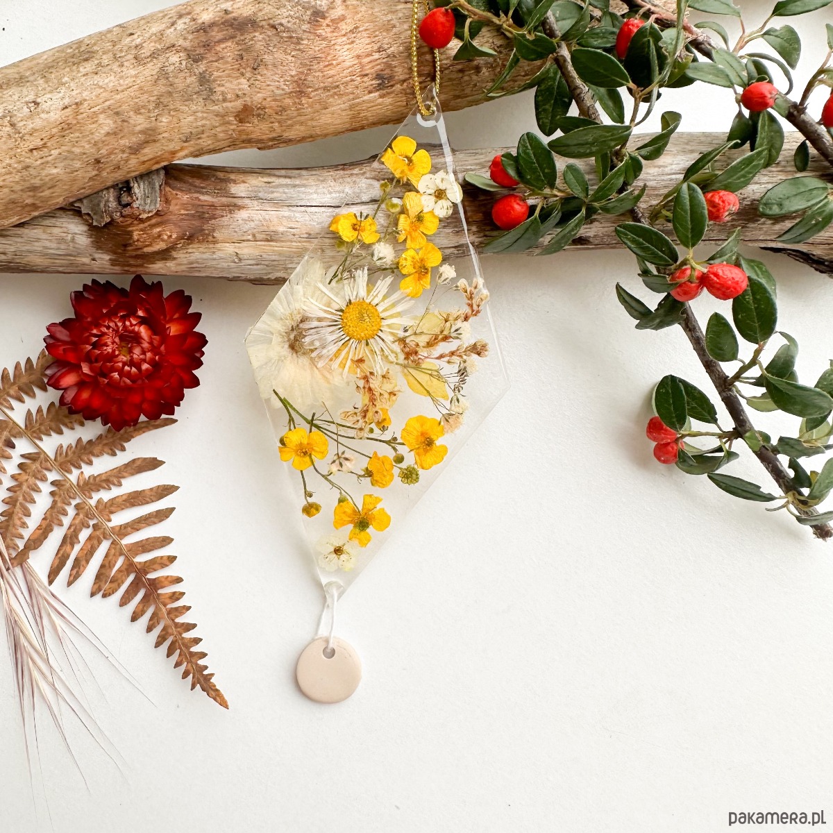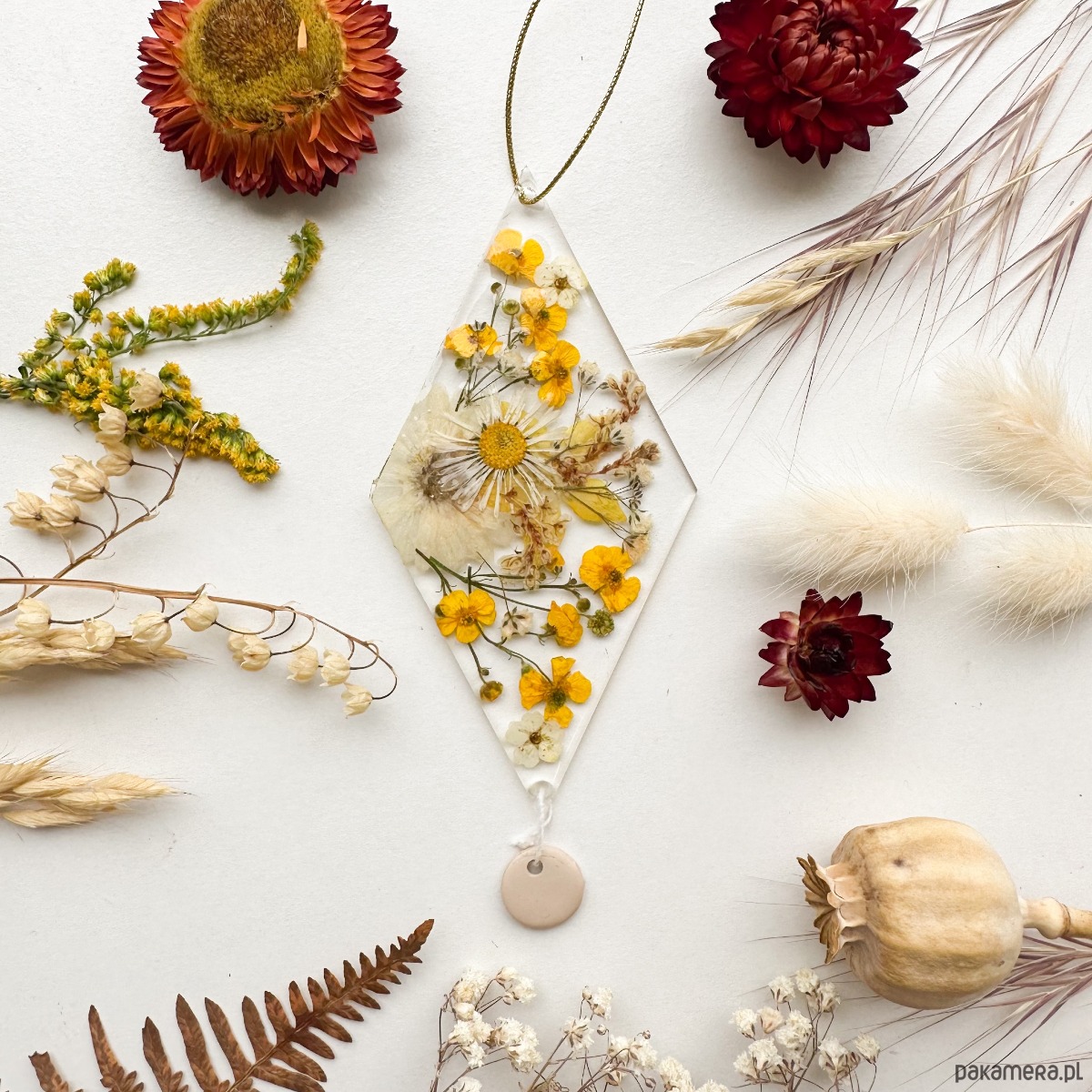 Ręcznie robiona świąteczna zawieszka z suszonymi kwiatami w kształcie rombu to wyjątkowa dekoracja i niebanalny prezent na choinkę.