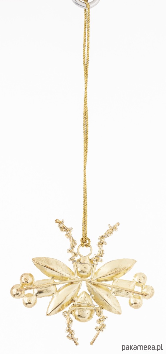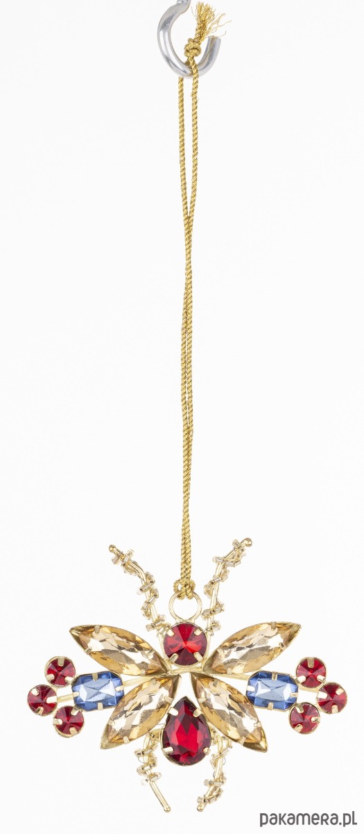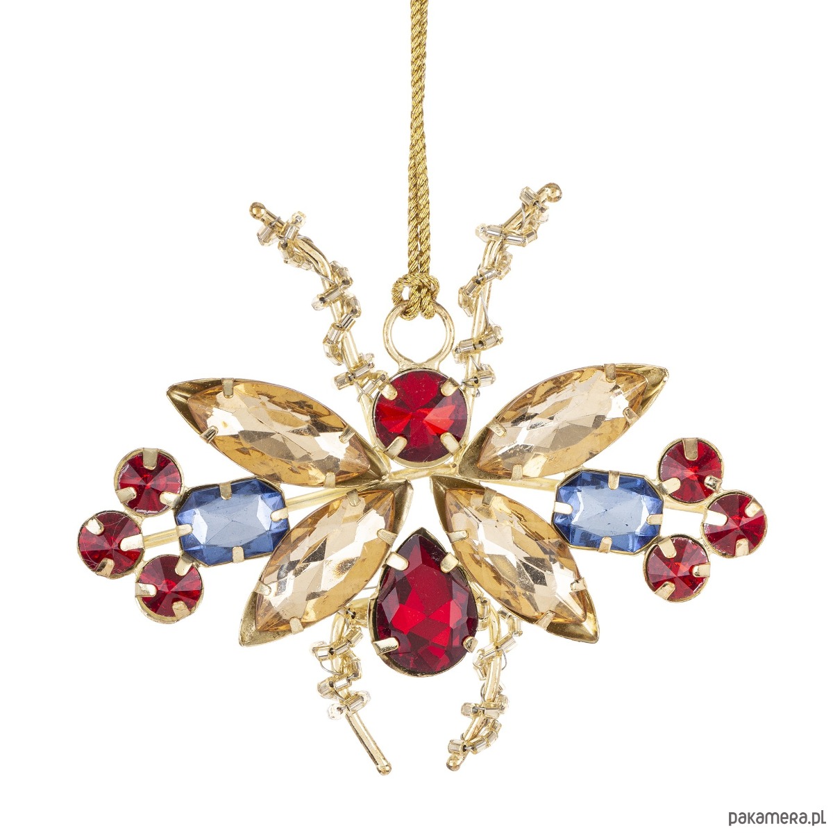 Kolorowa zawieszka wykonana z metalu i z akrylu. Ma kształt owada, którego skrzydełka są pełne kolorowych kamieni. Czerwone szkiełka nadają mu uroku. Będą się pięknie mieniły na drzewku odbijając kolorowe światełka lampek.