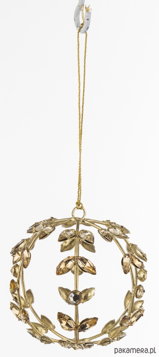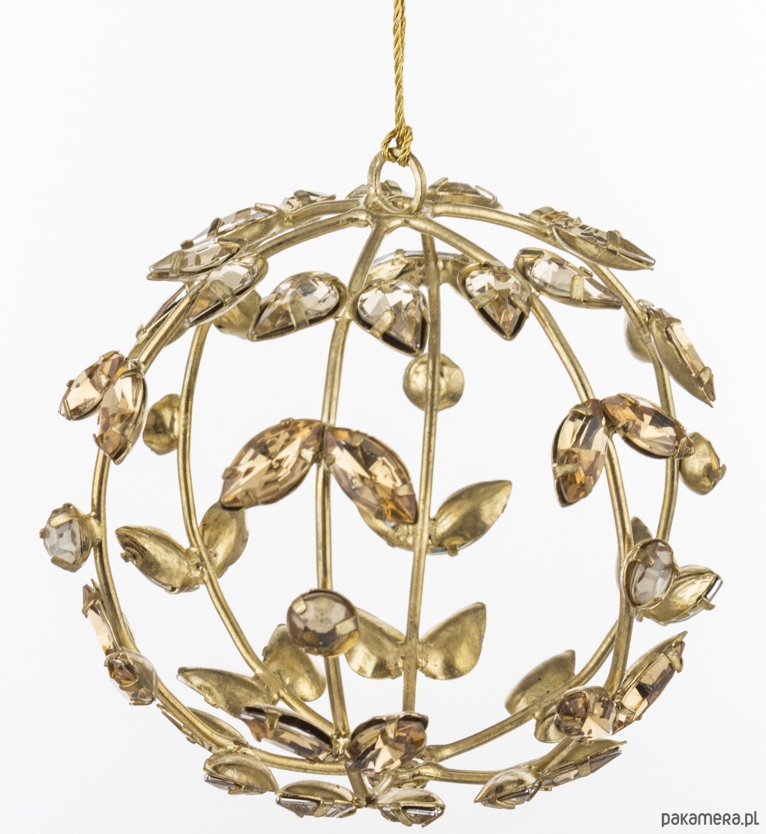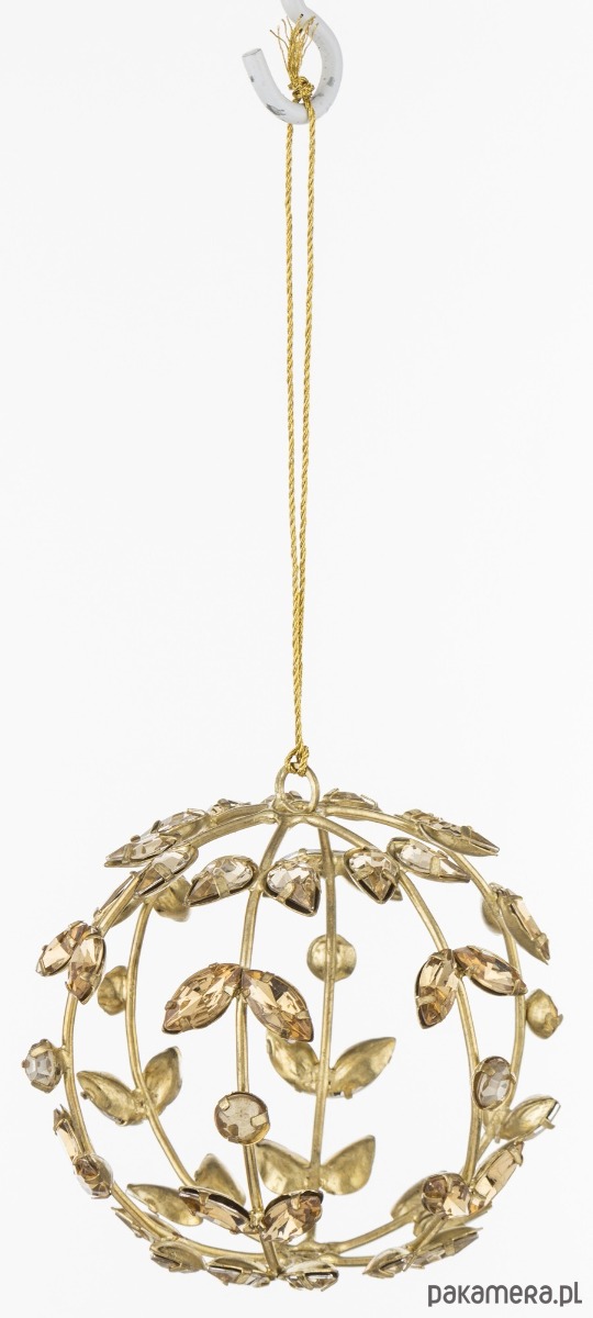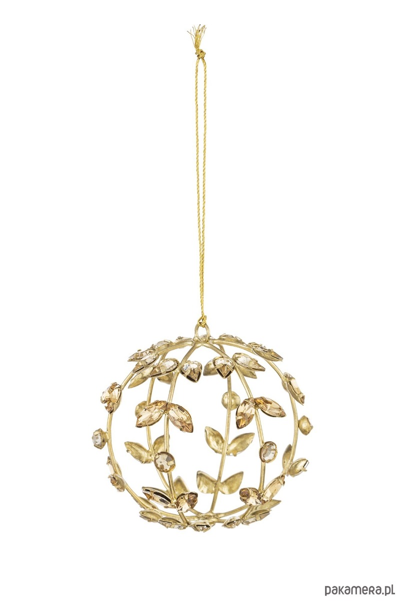 Złota zawieszka wykonana z metalu i z tworzywa sztucznego. Ma kształt kuli ażurowej, którą tworzą przezroczyste listki umocowane na metalowych prętach i nadają jej uroku. Będą się pięknie mieniły na drzewku odbijając kolorowe światełka lampek.