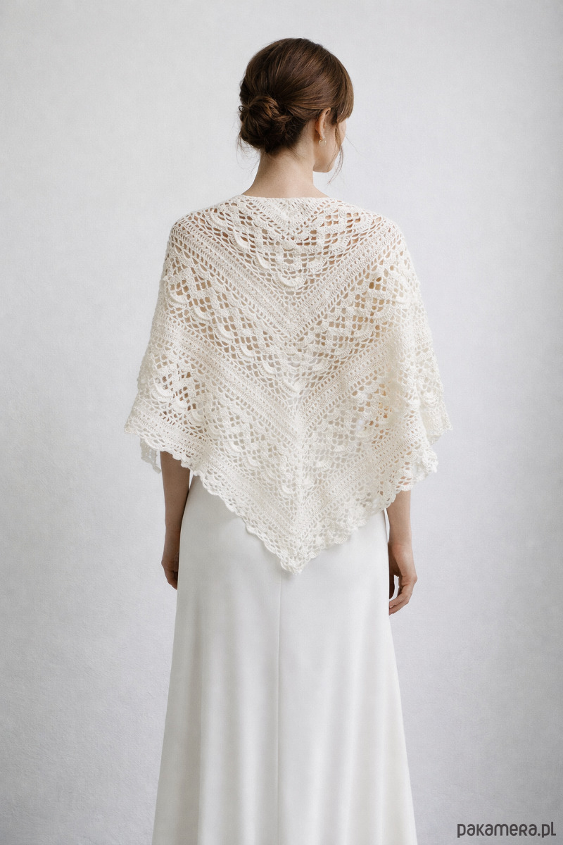 Ta chusta na ślub pasuje zarówno do klasycznych, jak i nowoczesnych stylizacji. Można założyć ją na ceremonię, przyjęcie weselne, a po ślubie nosić również na co dzień — jako elegancki szal lub chustę handmade do sukienek i płaszczy.
