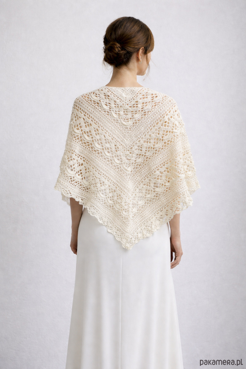 Ta chusta na ślub pasuje zarówno do klasycznych, jak i nowoczesnych stylizacji. Można założyć ją na ceremonię, przyjęcie weselne, a po ślubie nosić również na co dzień — jako elegancki szal lub chustę handmade do sukienek i płaszczy.