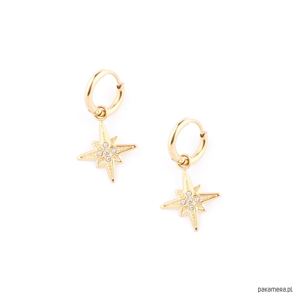 Kolczyki Ozdobna Iskierka to subtelny blask zamknięty w złotej formie. Delikatne koła z zawieszką w kształcie ośmioramiennej gwiazdy zdobionej białymi cyrkoniami dodają twarzy świetlistości i elegancji, przywołując skojarzenia z promieniem światła odbijającym się na tafli złota.