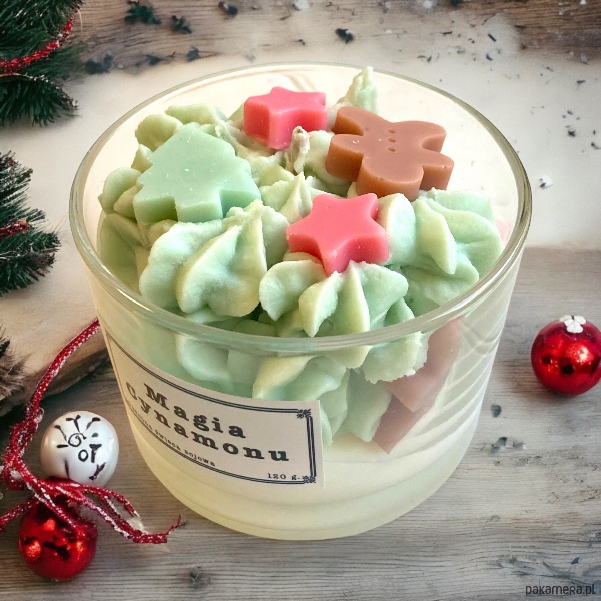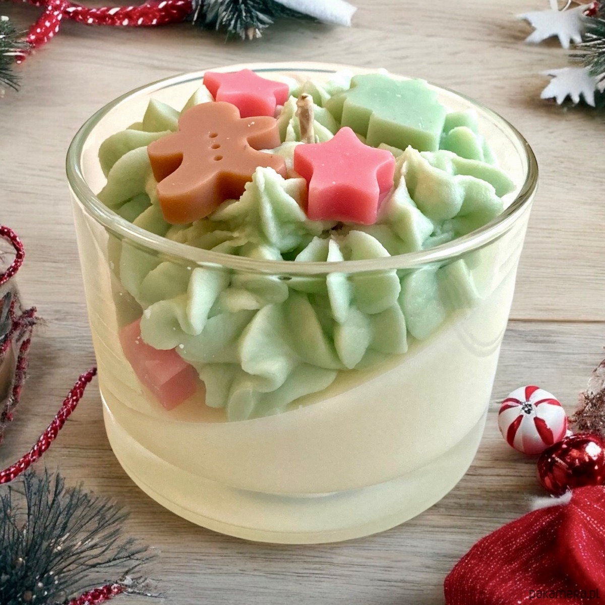 Niezwykła świeca, wspaniale wpisująca się w Bożonarodzeniowy klimat. Wykonana została z małych woskowych gwiazdek, choinek i piernikowych ludzików ułożonych na asymetrycznej podstawie. Całość pachnie magicznie cynamonowo.