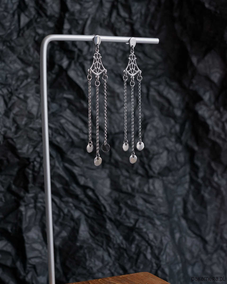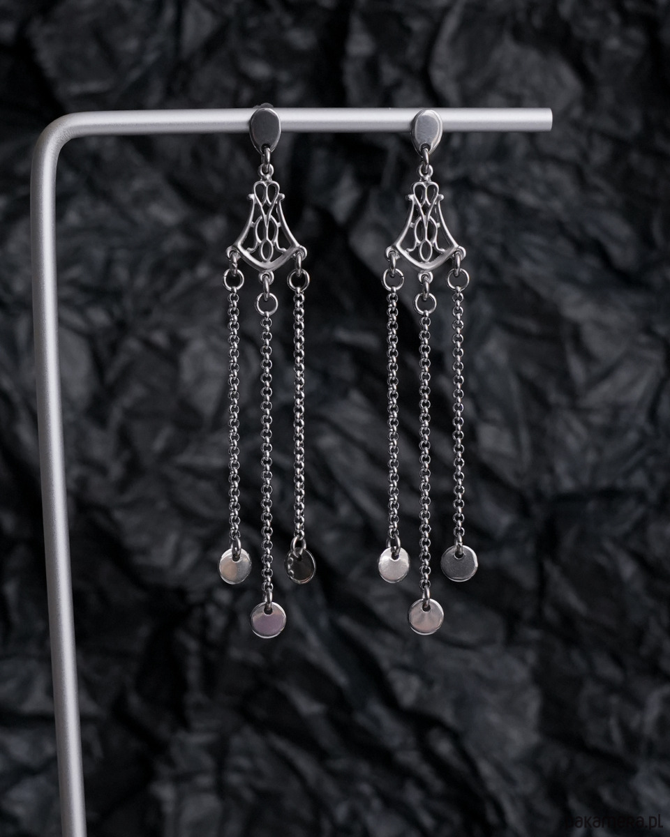 Ozdobne i unikatowe, długie, wiszące kolczyki z łańcuszkami i okrągłymi blaszkami, zawieszone na sztyftach w kształcie łezki. Do noszenia na co dzień i na imprezę. Mogą przypaść do gustu fankom stylu goth, fantasy, itp.