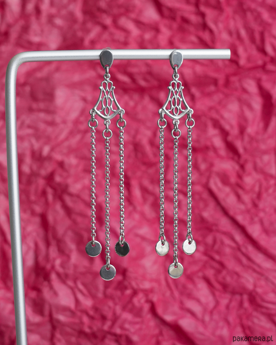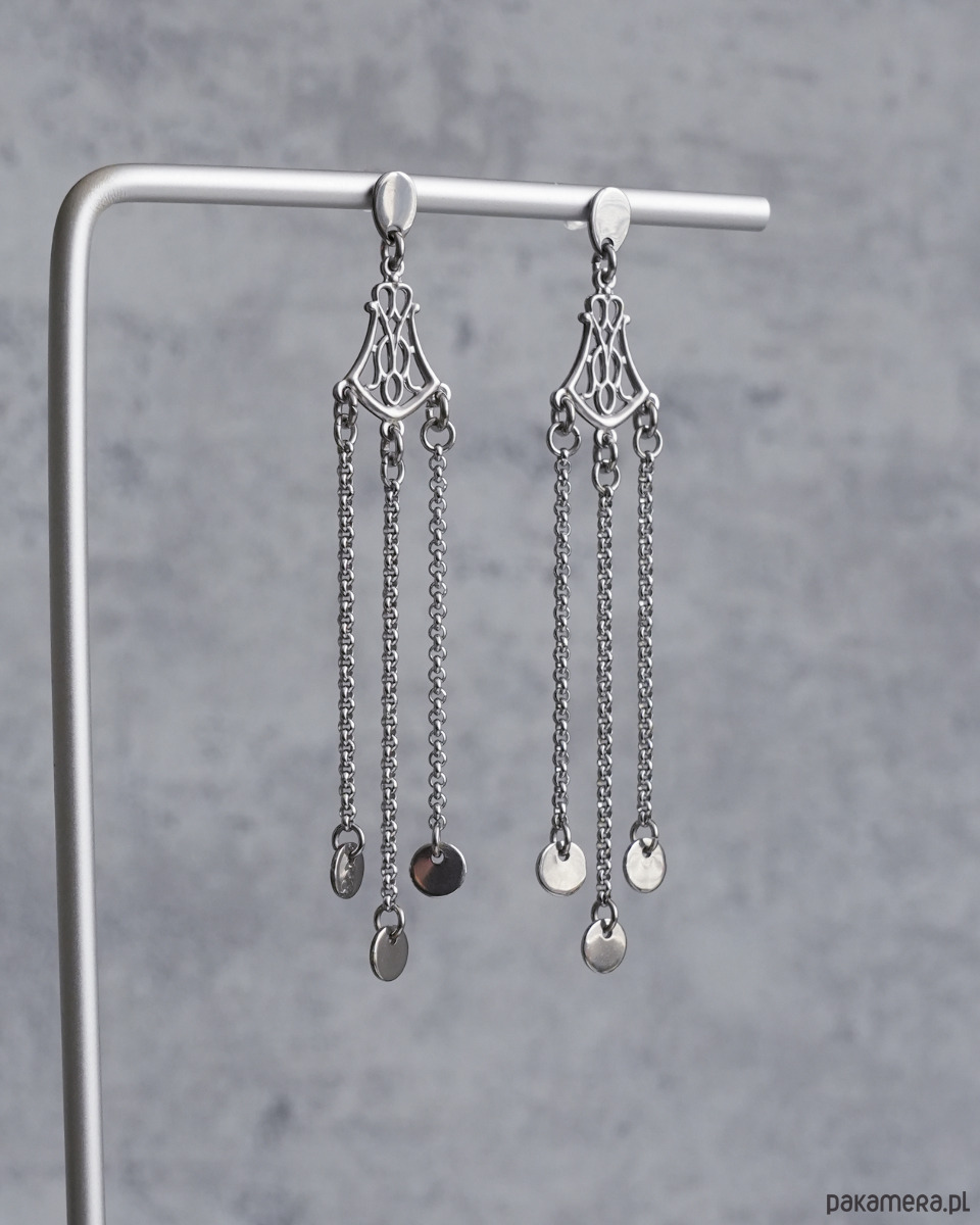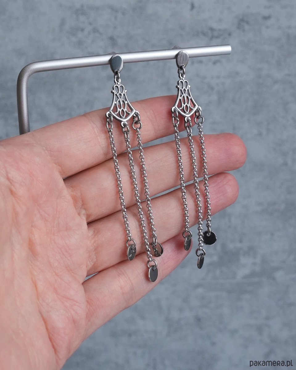 Ozdobne stalowe kolczyki z łańcuszkami i blaszkami