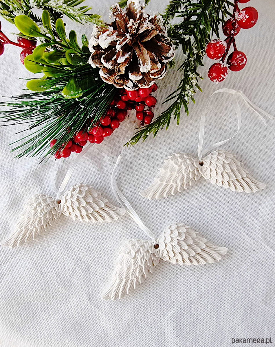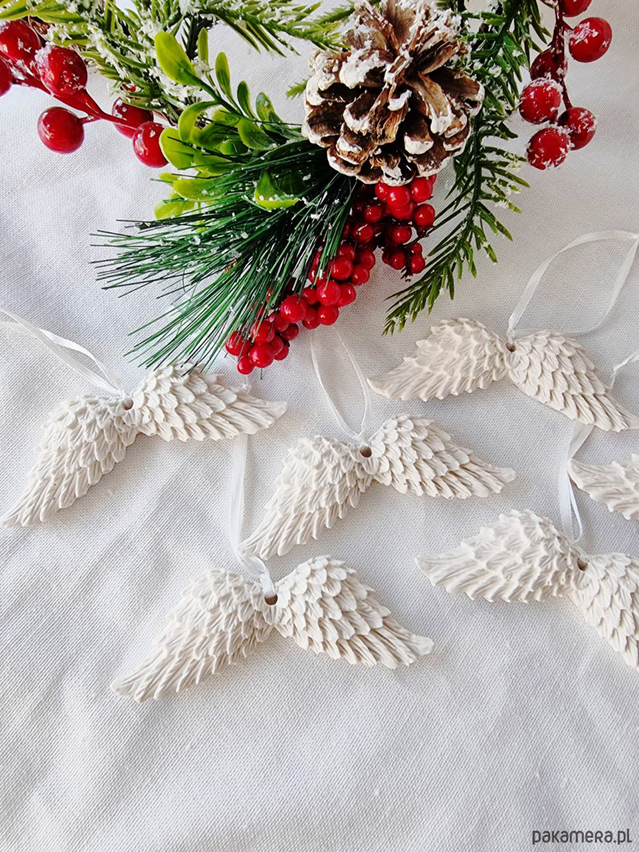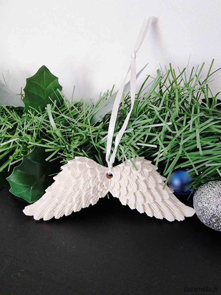Ozdobne zawieszki skrzydła z gipsu polimerowego stworzone w całości ręcznie – od odlewu, mieszania kolorów, szlifowania po impregnowanie.