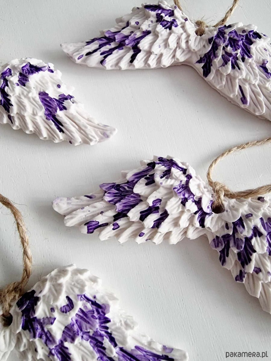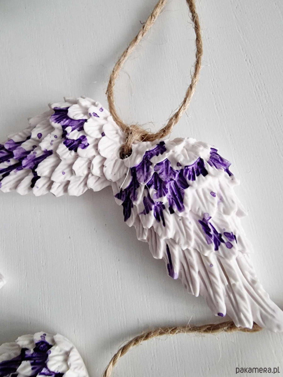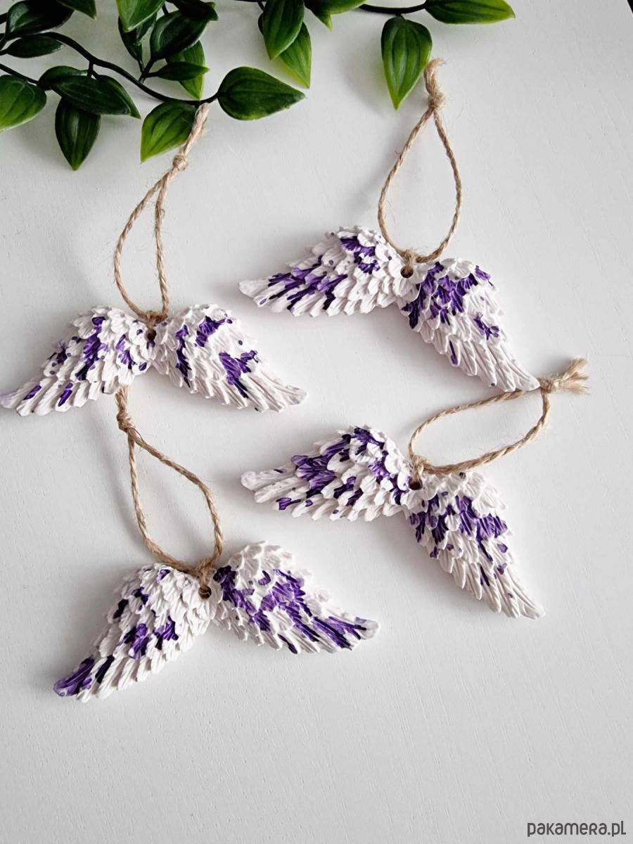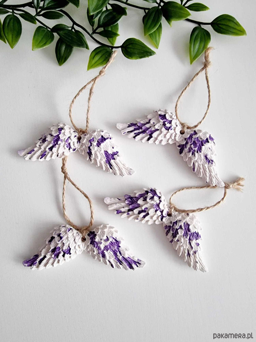 Ozdobne zawieszki skrzydła z gipsu na choinkę stworzone w całości ręcznie – od odlewu, mieszania kolorów, szlifowania po impregnowanie.