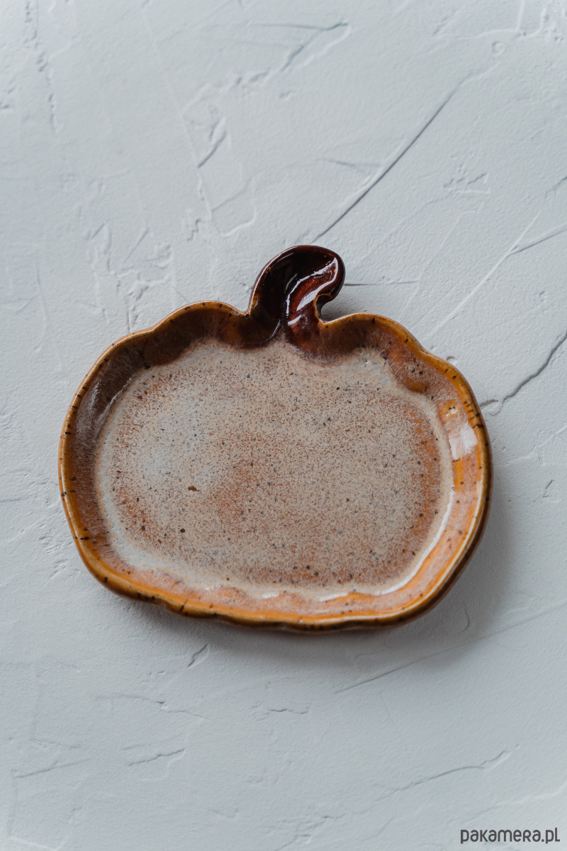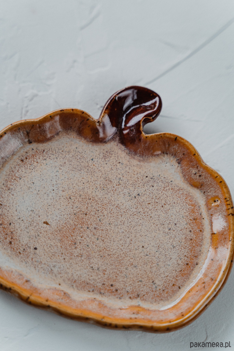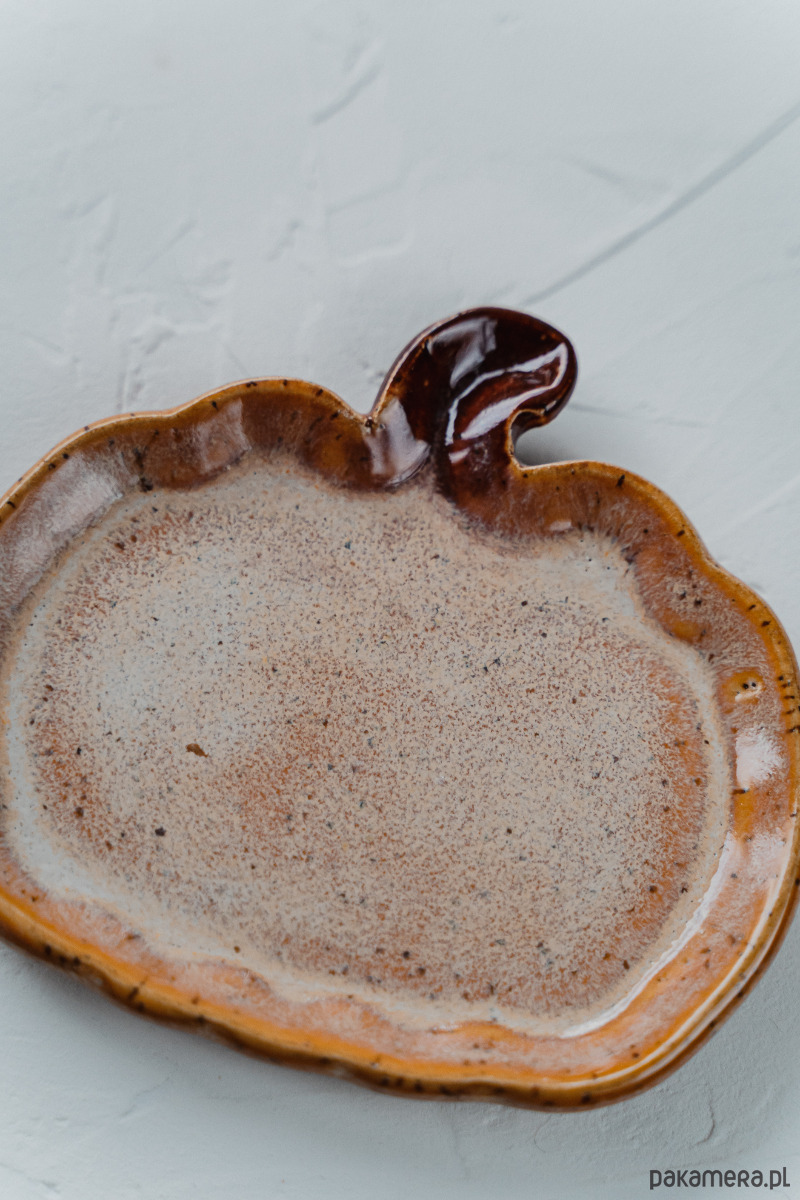 Ceramiczny talerzyk w kształcie jabłka, wykonany ręcznie z jasnej, nakrapianej gliny i pokryty błyszczącym szkliwem. Idealny na drobne przekąski, desery, owoce lub jako dekoracyjny talerzyk na dodatki czy biżuterię
