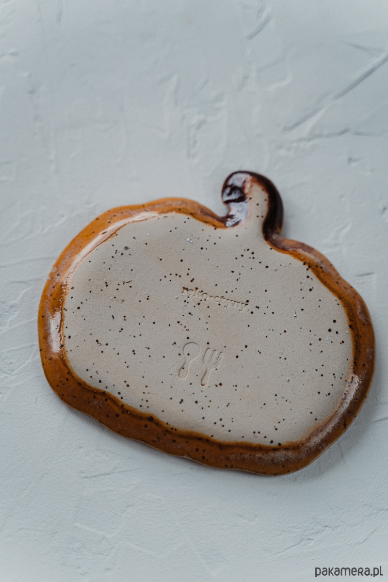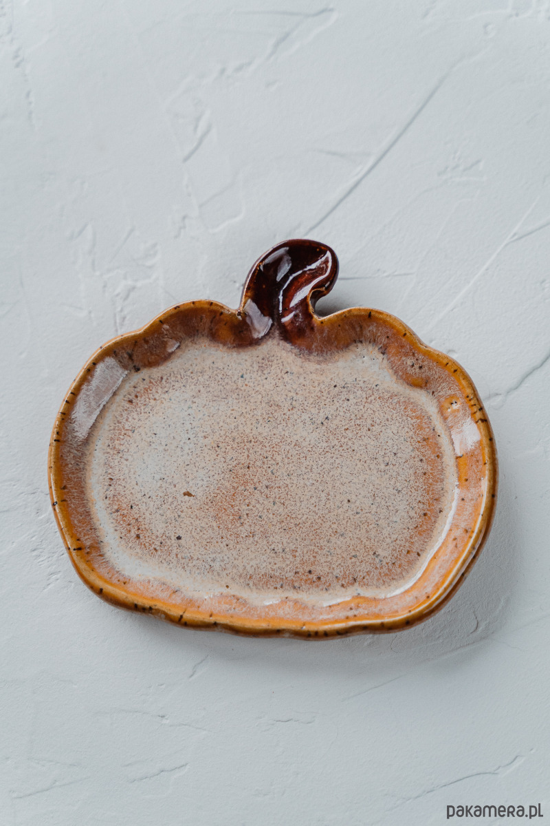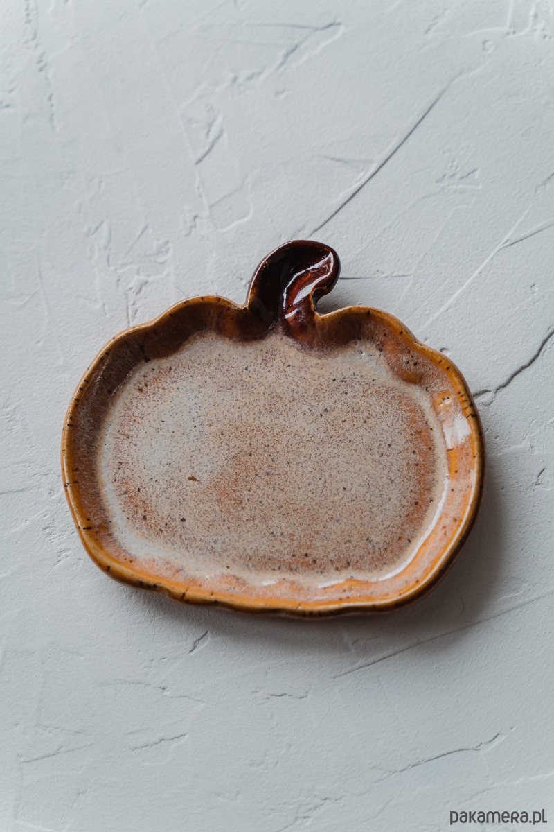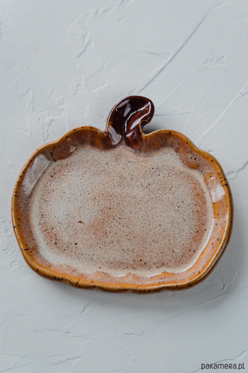 Ceramiczny talerzyk w kształcie jabłka, wykonany ręcznie z jasnej, nakrapianej gliny i pokryty błyszczącym szkliwem. Idealny na drobne przekąski, desery, owoce lub jako dekoracyjny talerzyk na dodatki czy biżuterię