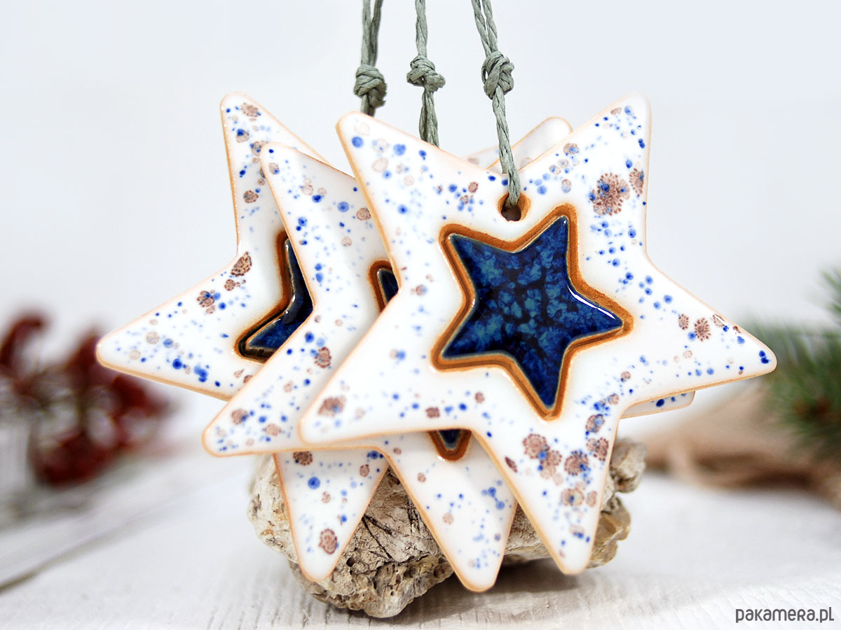 Komplet zawiera trzy ceramiczne gwiazdki choinkowe. Ozdoby są ręcznie robione i szkliwione co gwarantuje ich niepowtarzalność i indywidualny charakter. Można je powiesić klasycznie - na choince, ale pięknie będą się prezentować w oknie czy na ścianie. Ceramiczne ozdoby to również fajny pomysł na świąteczny prezent dla twoich najbliższych :)