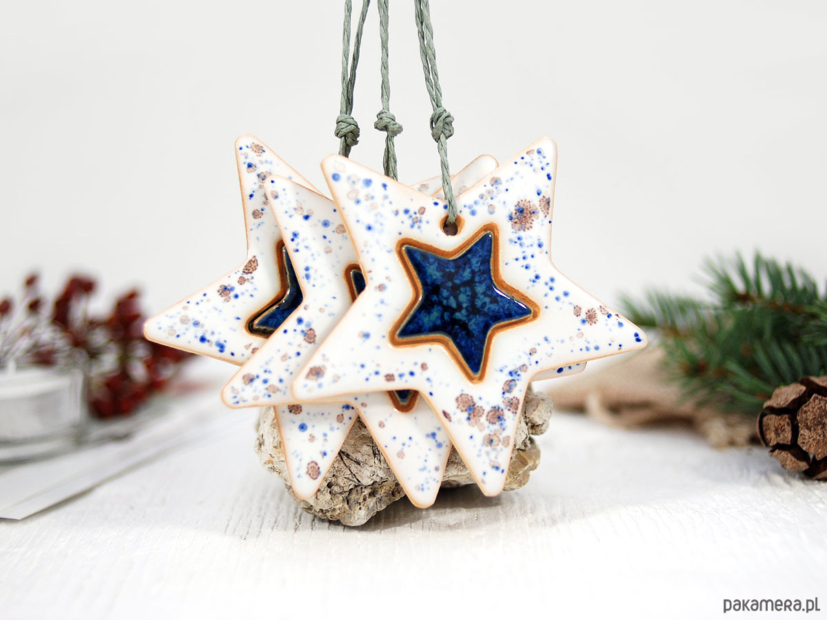 Komplet zawiera trzy ceramiczne gwiazdki choinkowe. Ozdoby są ręcznie robione i szkliwione co gwarantuje ich niepowtarzalność i indywidualny charakter. Można je powiesić klasycznie - na choince, ale pięknie będą się prezentować w oknie czy na ścianie. Ceramiczne ozdoby to również fajny pomysł na świąteczny prezent dla twoich najbliższych :)