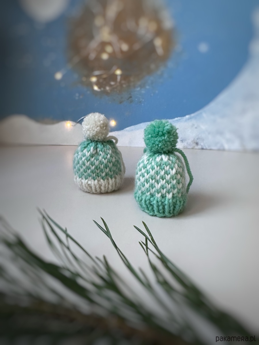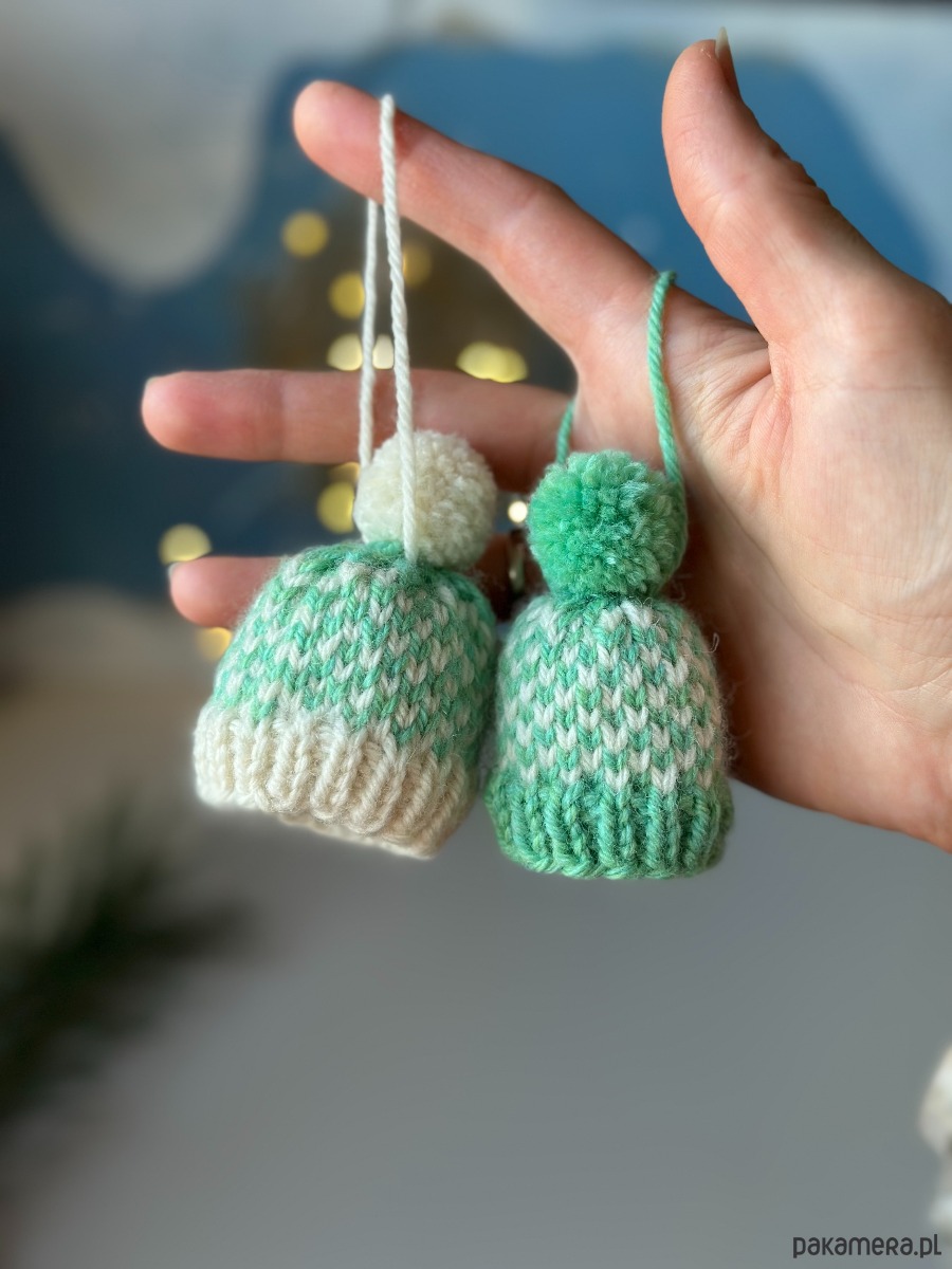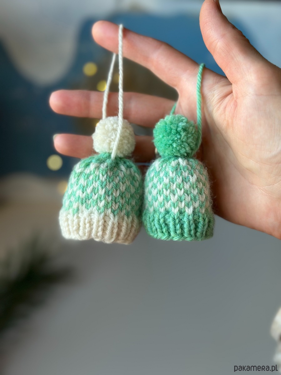 Zestaw 2 szt. zawieszek choinkowych, mini-czapeczek, wykonanych ręcznie na drutach z wełny owczej.