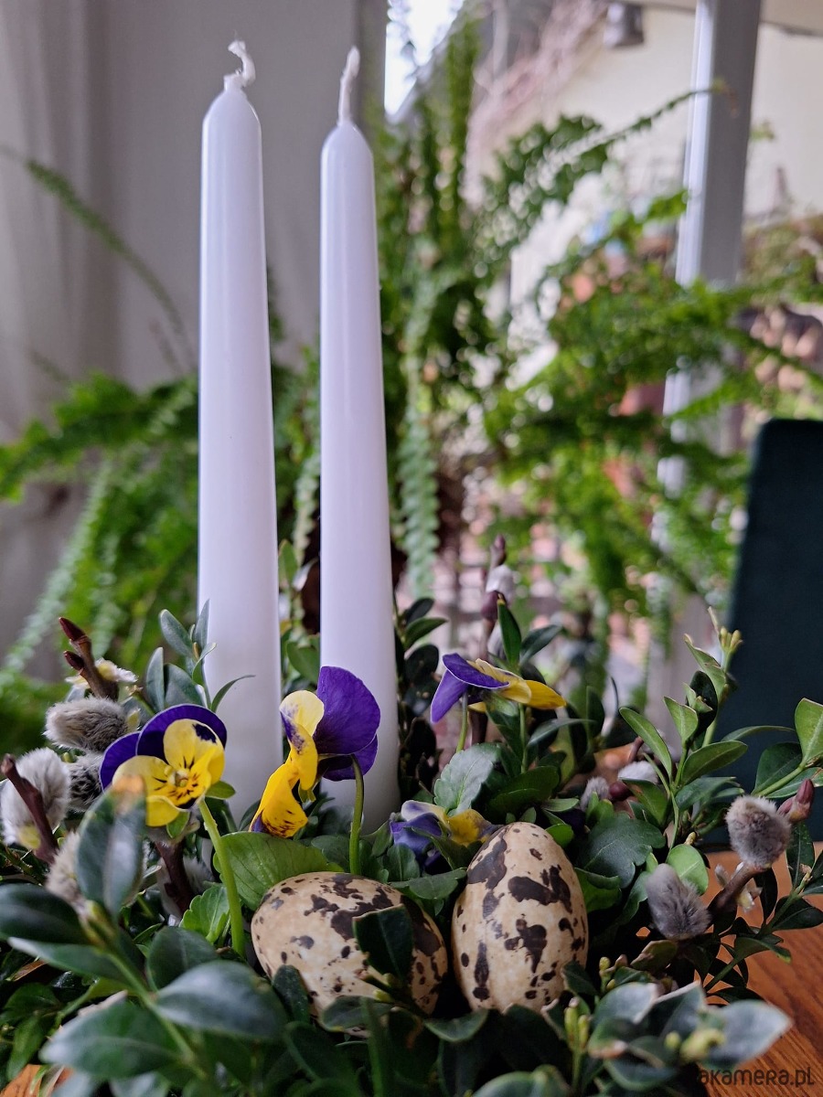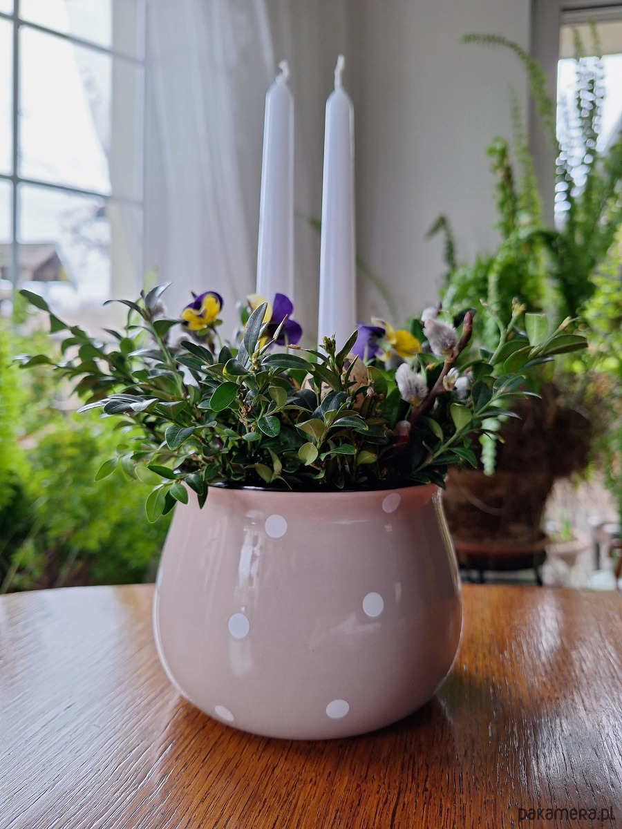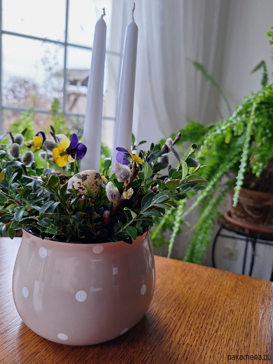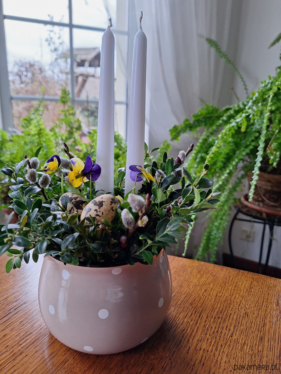 Dekoracja wielkanocna . Doniczka ceramiczna ,bratki w doniczce, świece bukszpan ,bzie i jajka .