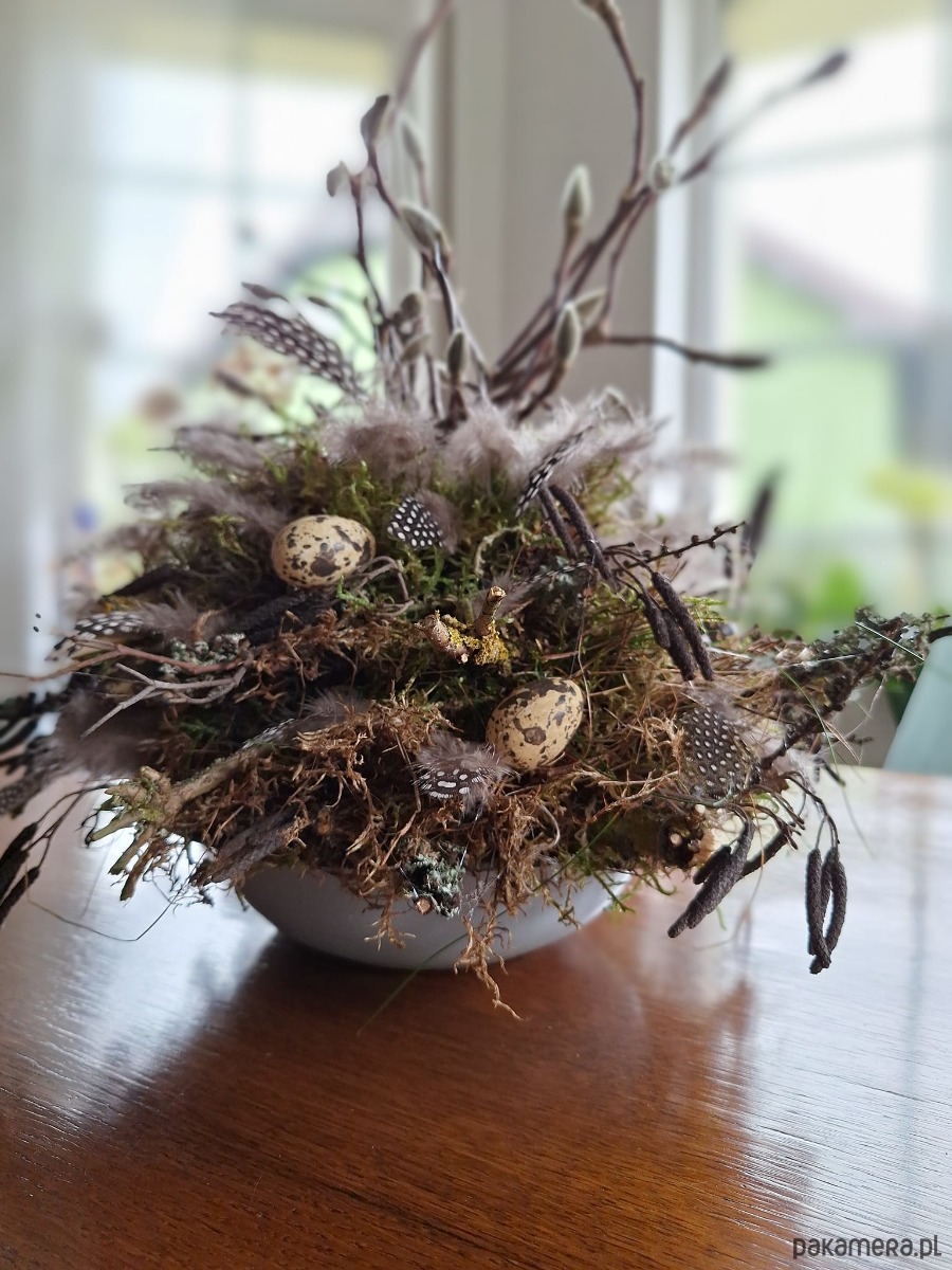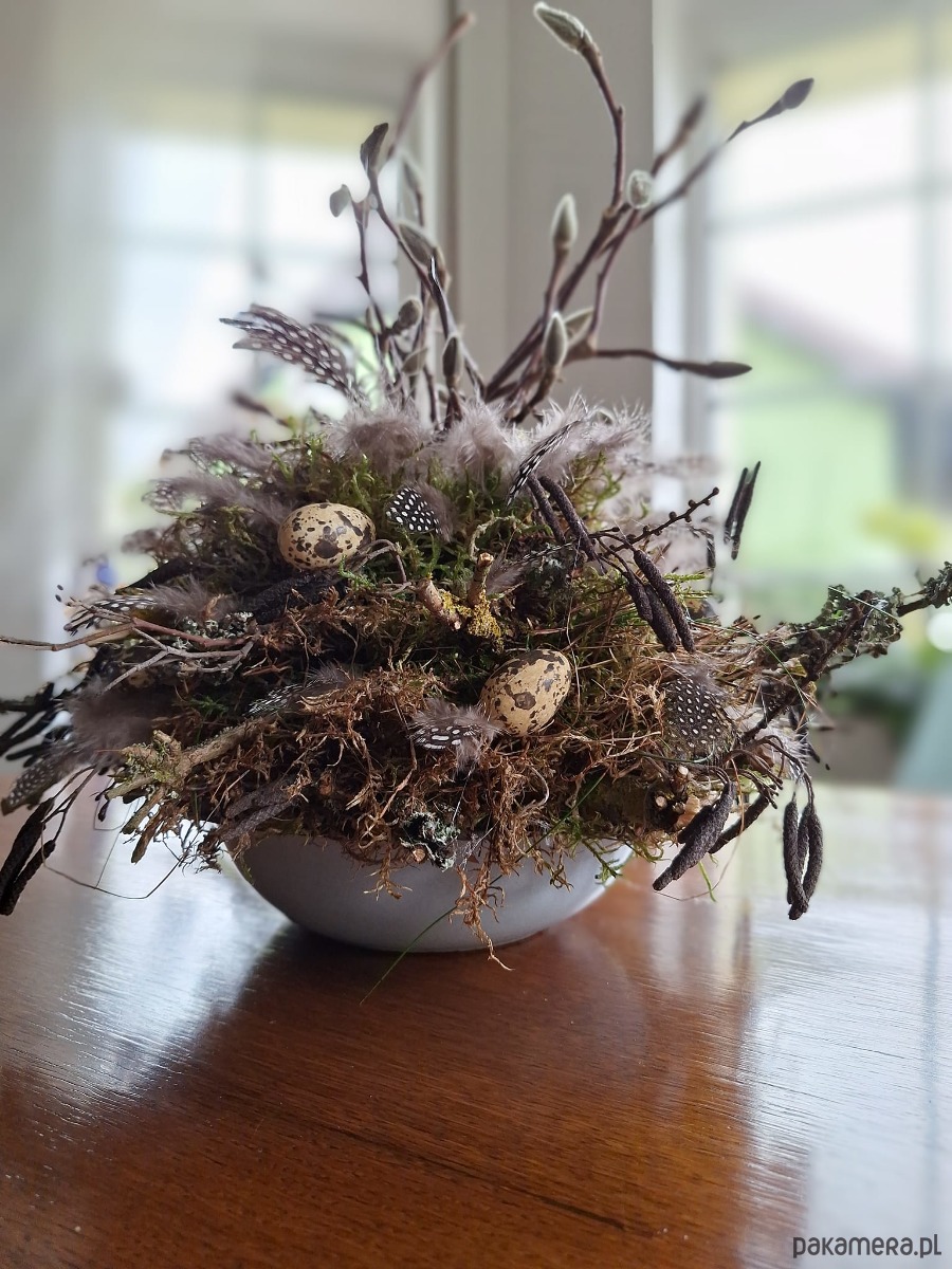 Dekoracja wielkanocna w używanej misce .Mech ,pióra przepiórki i jajka