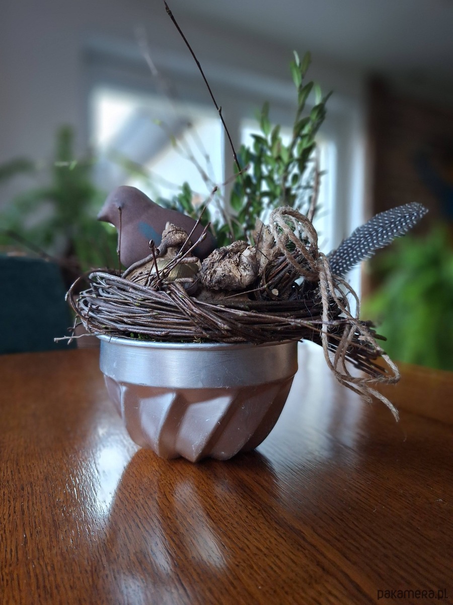 Dekoracja w naczyniu koloru brązu i stali z mchem ,baziami , bukszpanem , brzozą, ptakiem z metalu i piórami i korzeniem