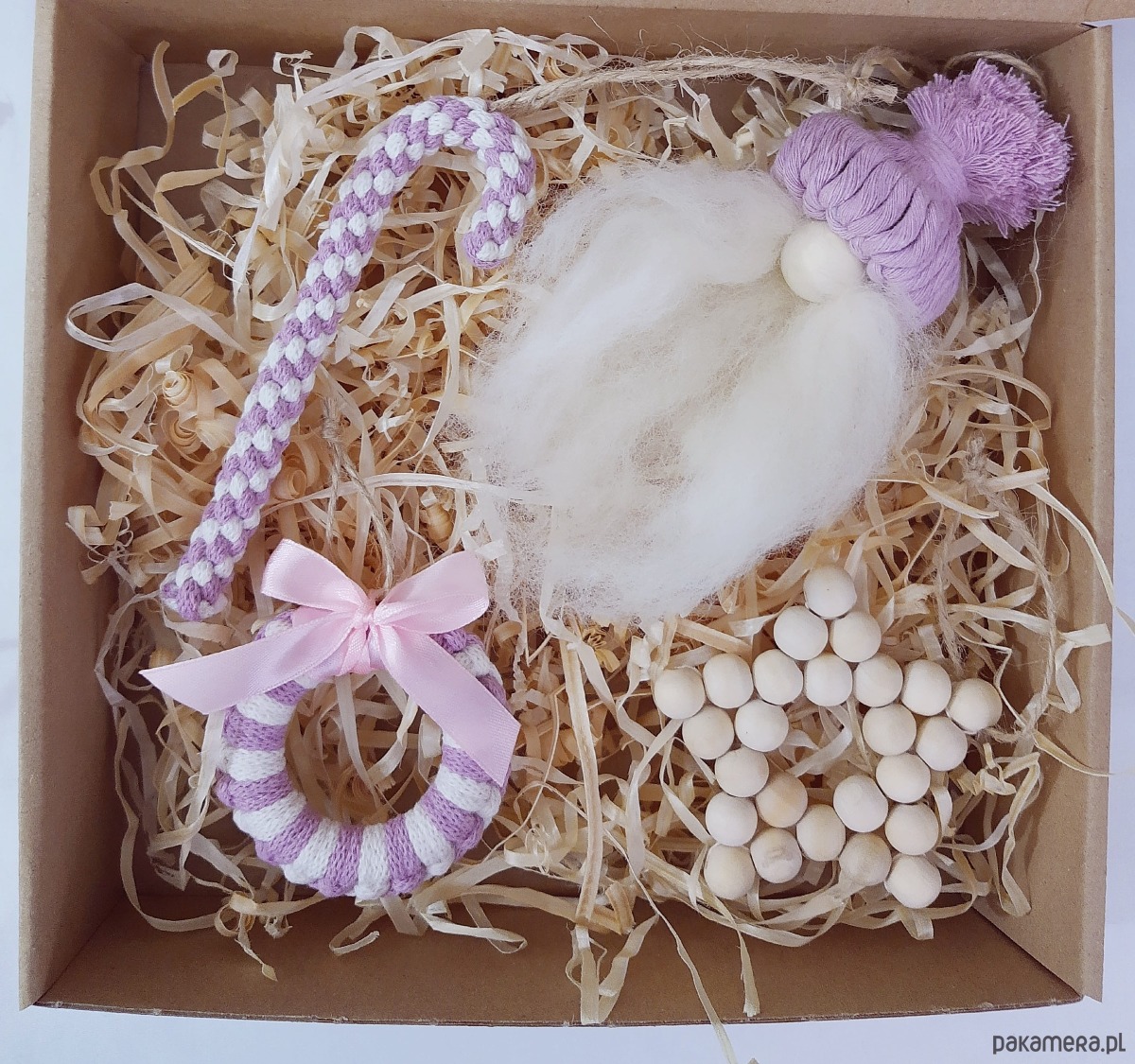 Zestaw zapakowany jest w eko pudełeczko z okienkiem, które przewiązuję papierową raffią z przewieszoną świąteczną etykietką - ozdoby tak zapakowane możesz podarować w prezencie, od razu podając informację dla kogo prezent jest adresowany.