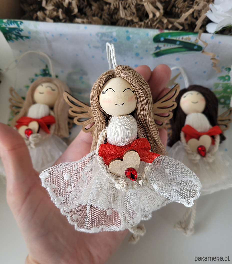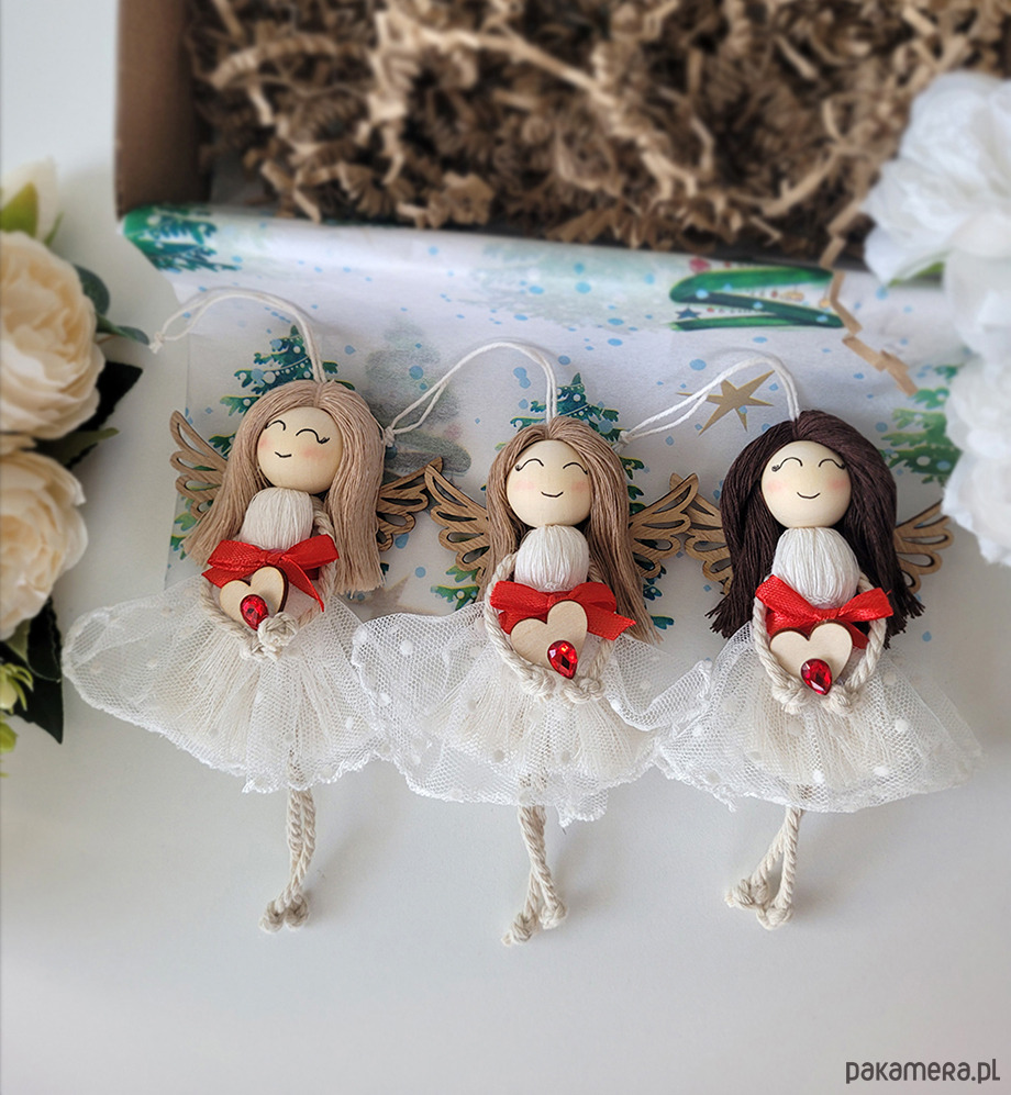 Przepiękne aniołki makramowe na choinkę lub do stroiku. Zestwa składa się z trzech aniołków w kolorze ecru z dodatkiem czerwieni. Każdy ma inny kolor włosów: jasny blond, blond ciemniejszy i brąz czekoladowy. W rączkach trzymają serduszka z czerwonym kryształkiem. Spódniczki z tiulu w kolorze ecru.