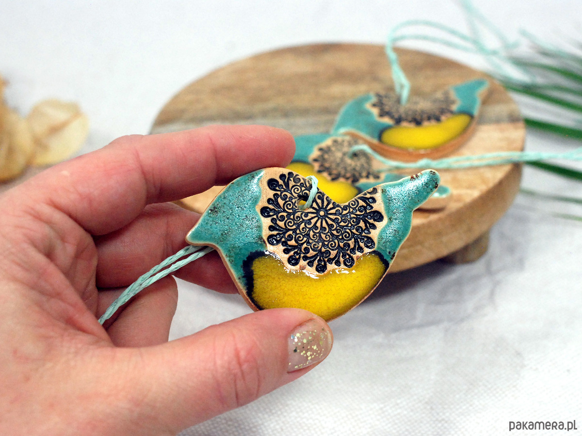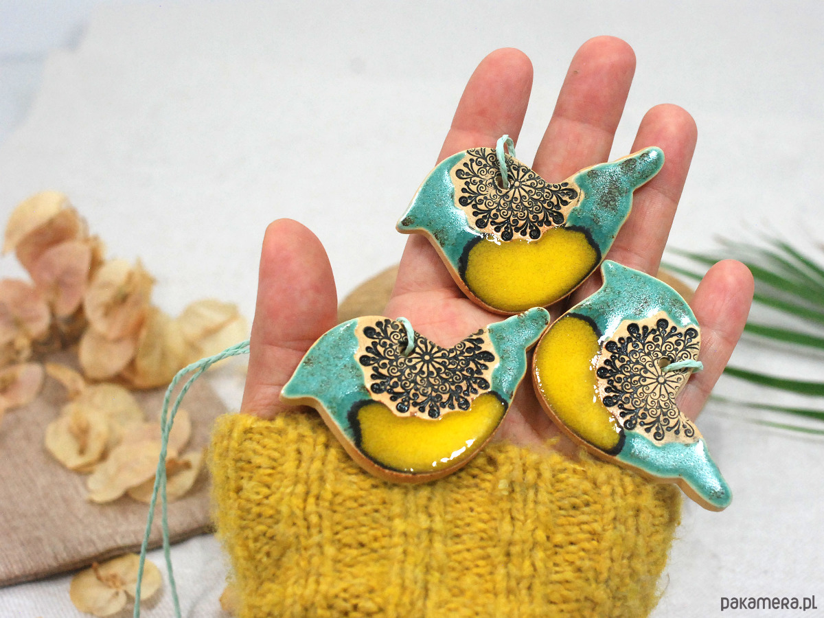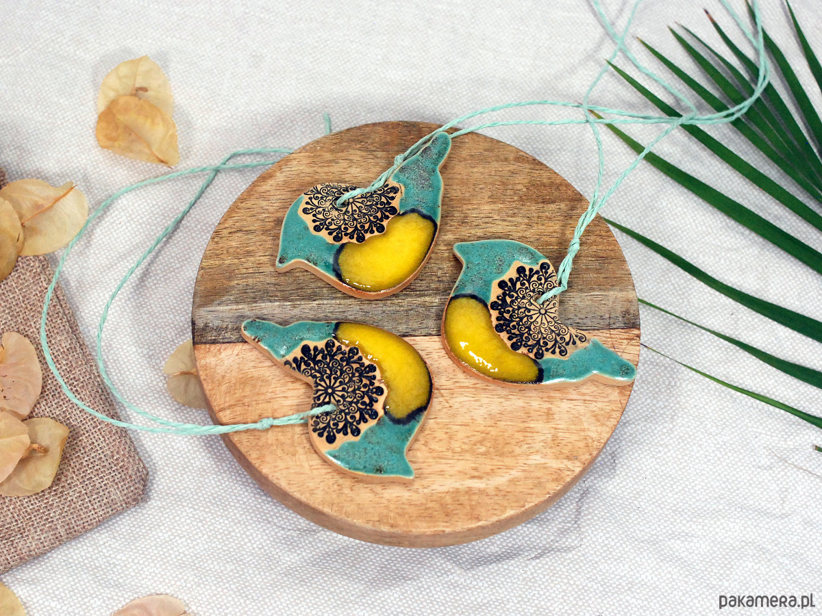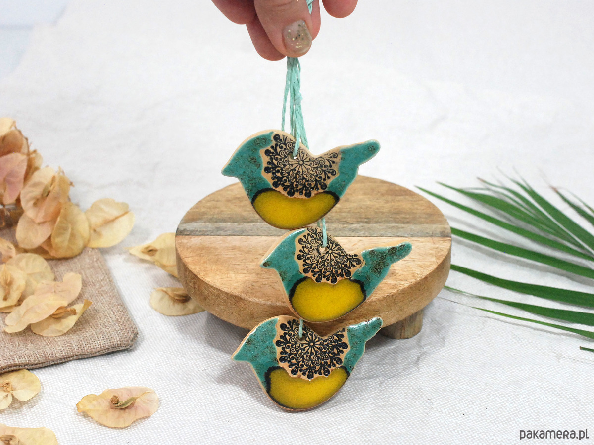 Ozdoby wiszące ptaszki z ornamentem - dekoracja ceramiczna