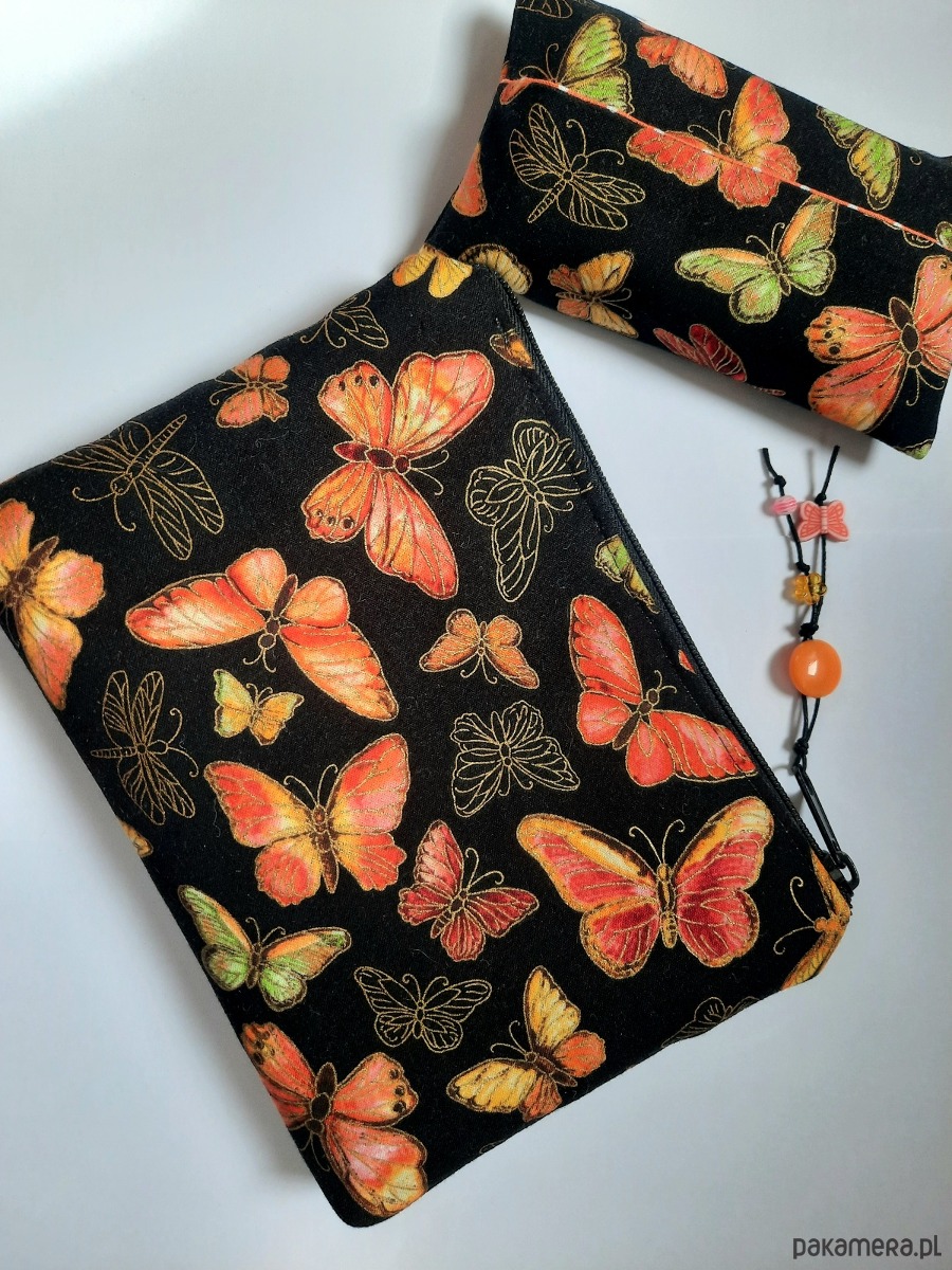 Komplet skladajacy się z kosmetyczki i etui na chusteczki. Wykonany jest z amerykańskiej bawełny najlepszej jakości. Kontury motylków złocone.