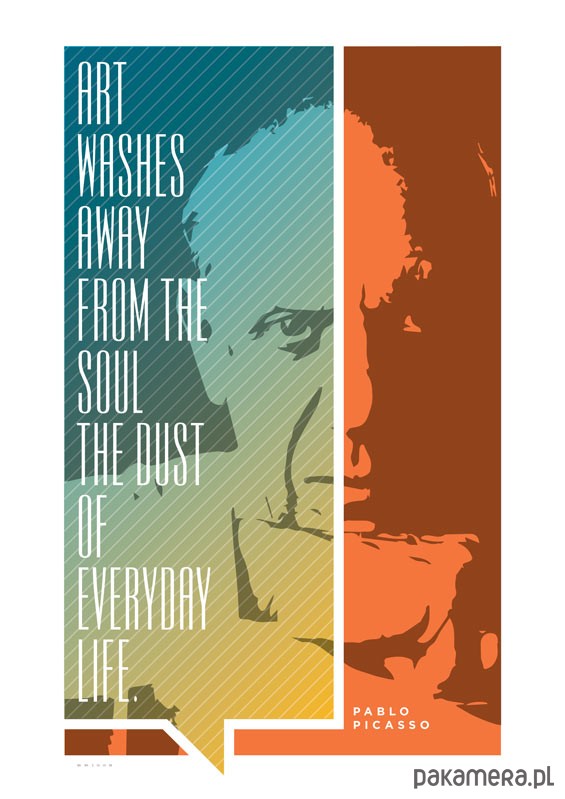 Plakat z autorską grafiką inspirowany postacią Pabla Picassa i jego sentencją "Art washes away from you soul the dust of everyday life".