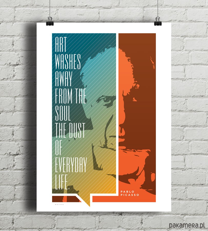 Plakat z autorską grafiką inspirowany postacią Pabla Picassa i jego sentencją "Art washes away from you soul the dust of everyday life".