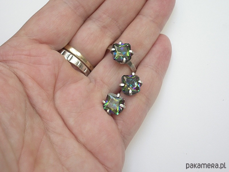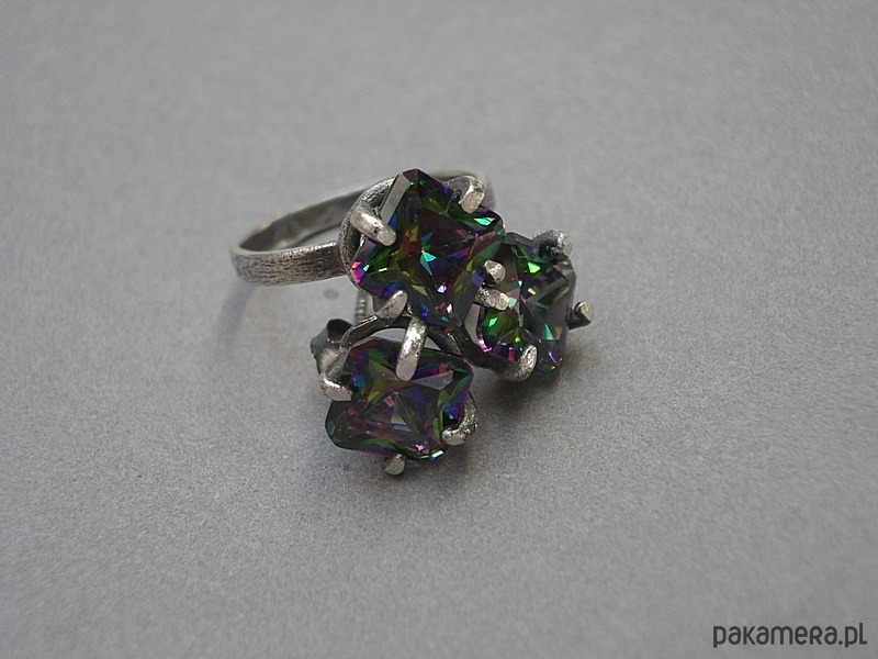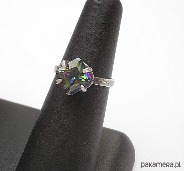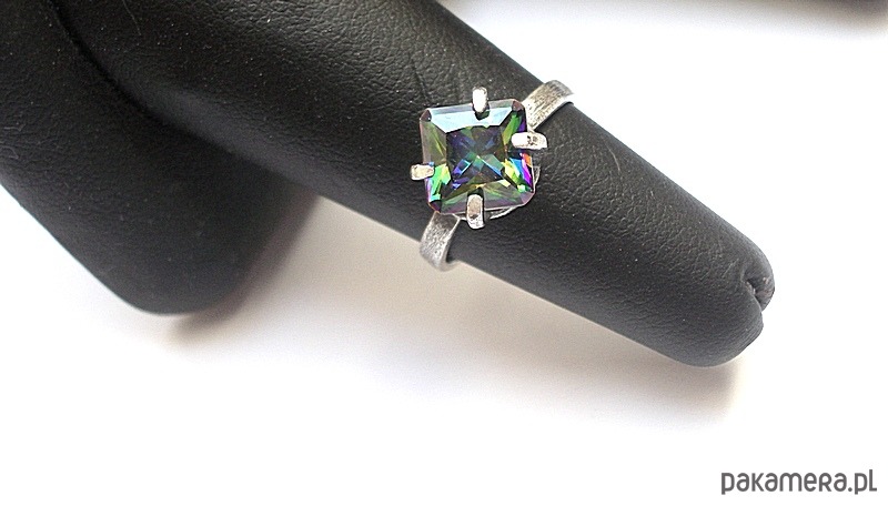 Pierścionek wykonany własnoręcznie od podstaw ze srebra [pr.925] w połączeniu z cyrkonią mystic [8mm]. Całość oksydowana i przetarta. Rozmiar jubilerski 13. Biżuteria ozdobnie zapakowana