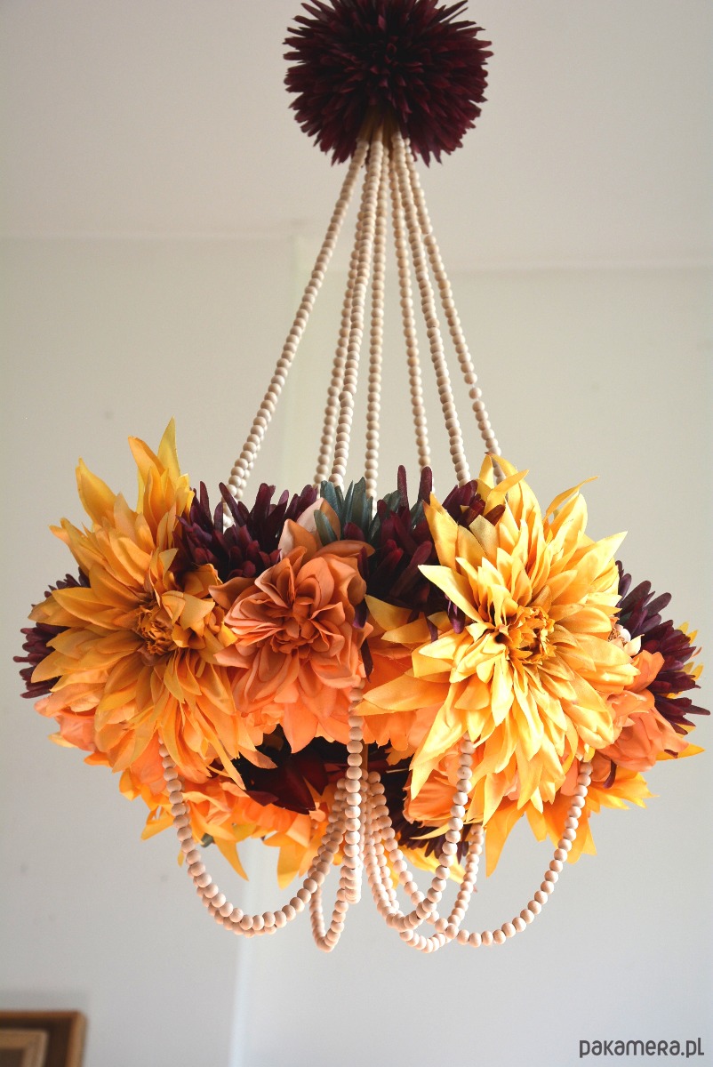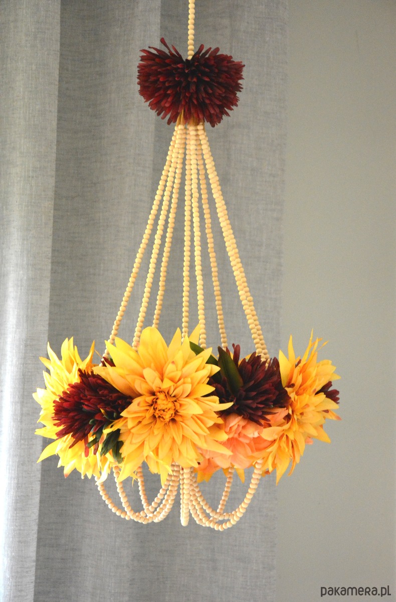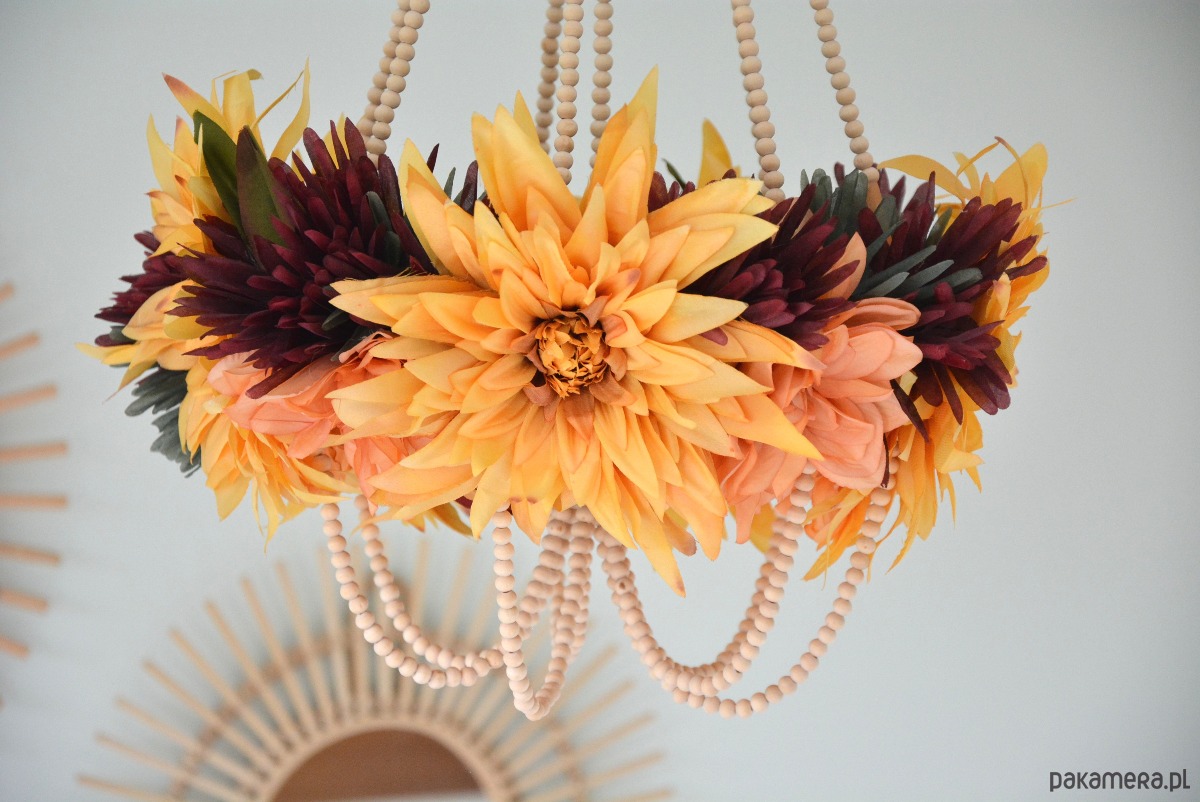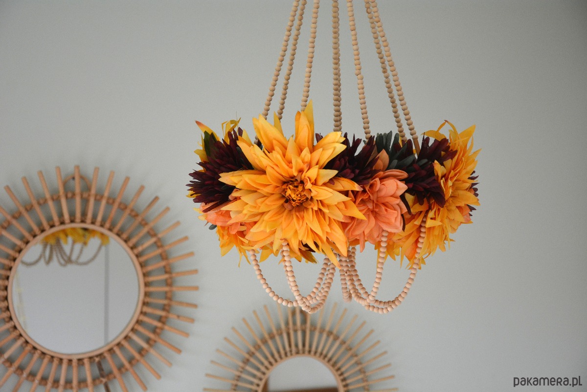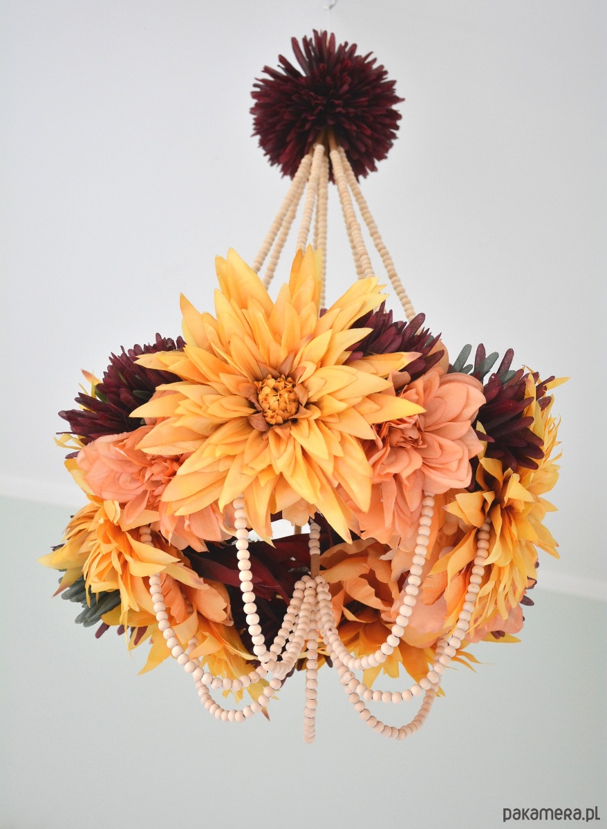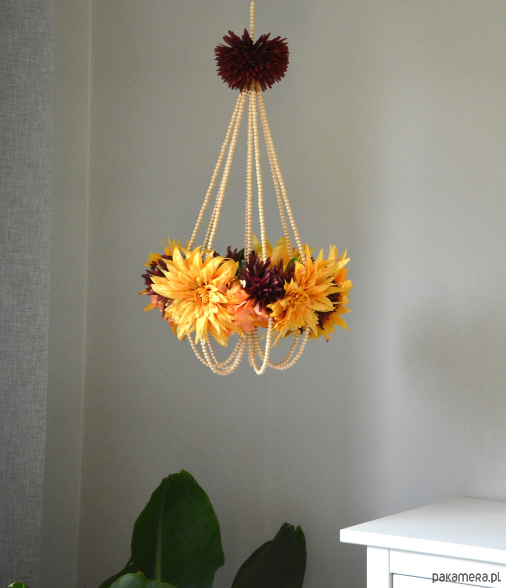 Pająk kwietny w nowoczesnym wydaniu. Konstrukcja oparta na drewnianych kulkach tworzy delikatną i oryginalną dekorację do każdego wnętrza.