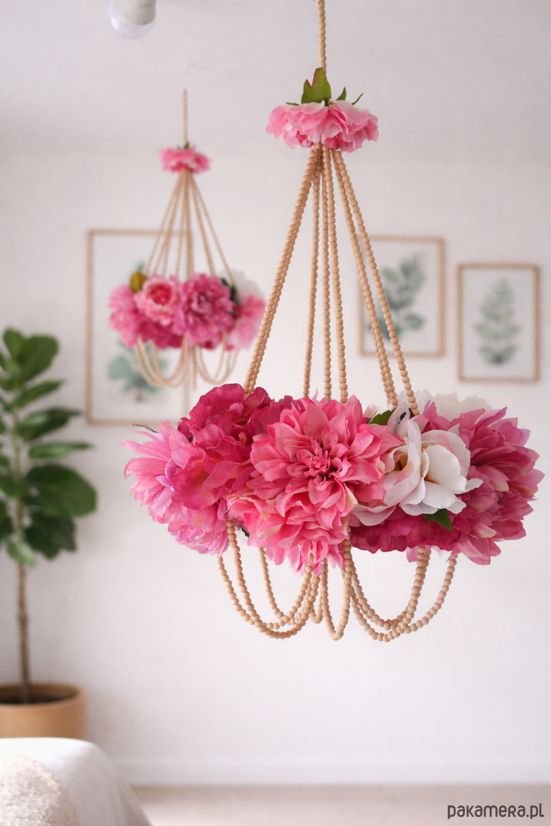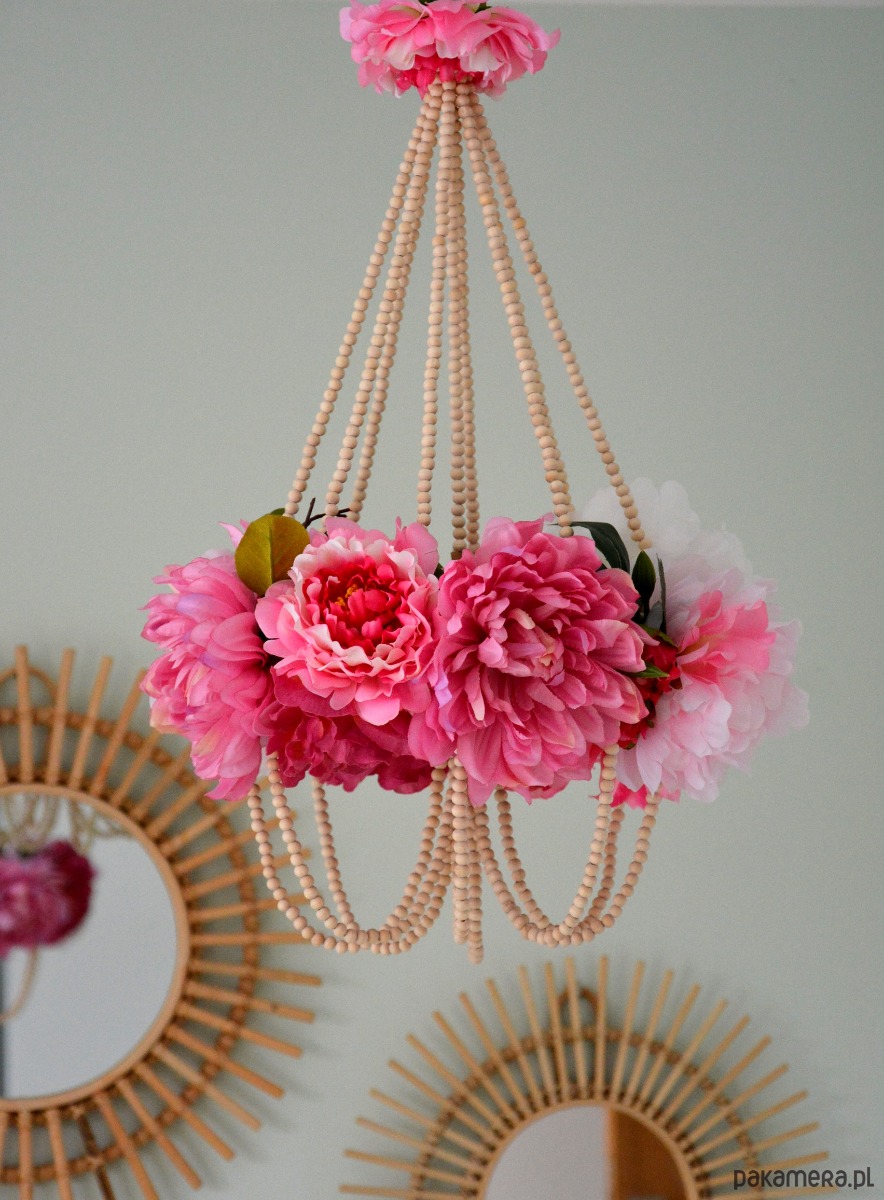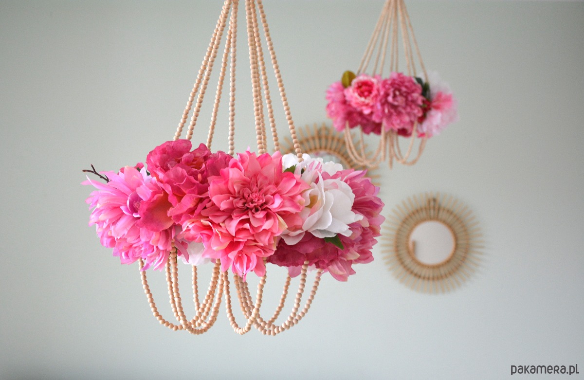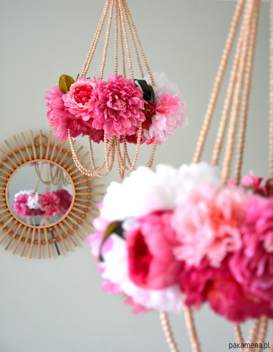 Pająk kwietny - dekoracja wisząca. Konstrukcja oparta na drewnianych kulkach tworzy delikatną i oryginalną dekorację do każdego wnętrza.
