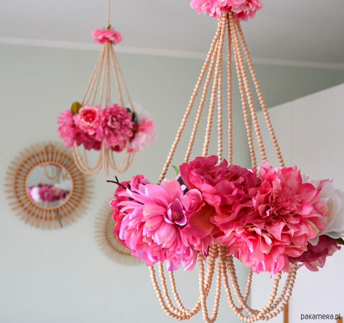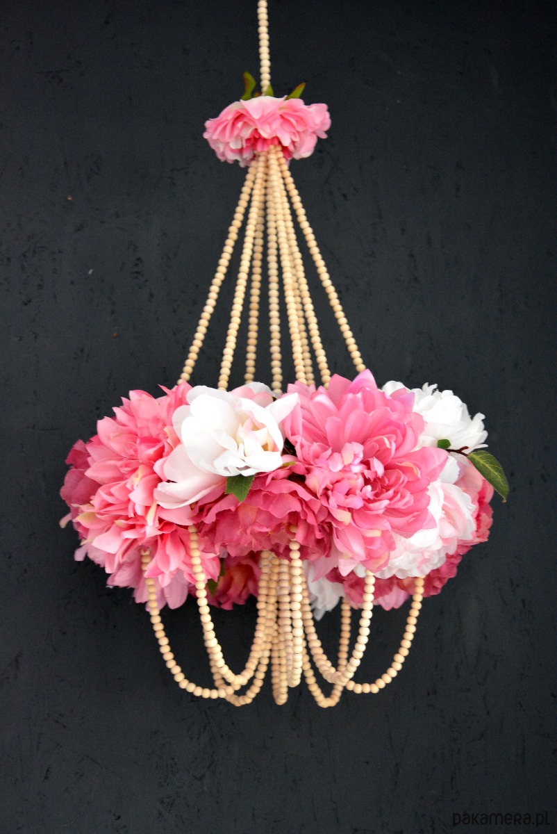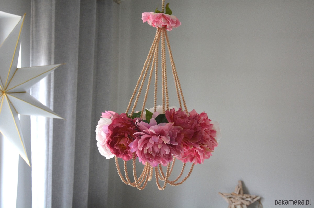 Pająk kwietny - dekoracja wisząca. Konstrukcja oparta na drewnianych kulkach tworzy delikatną i oryginalną dekorację do każdego wnętrza.