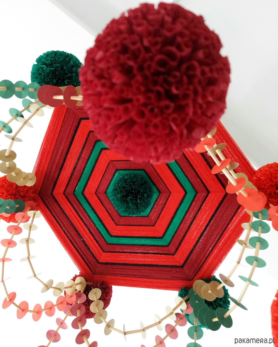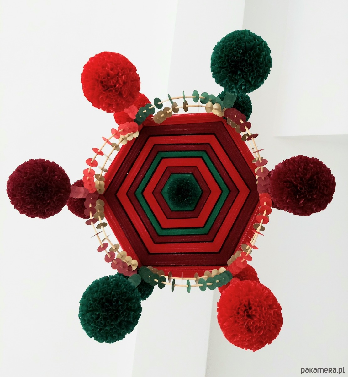 Duży pająk ludowy, model tarczowy sześcioramienny w całości wykonany ręcznie ze słomy, bibuły płaskiej i włóczki.